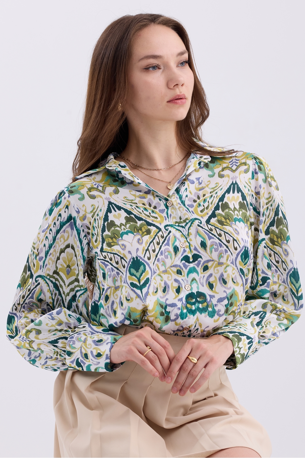 Kadın Etnik Desenli Balon Kollu Omuz Büzgü Detaylı Oversize Saten Gömlek Kadın Etnik Desenli Balon Kollu Omuz Büzgü Detaylı Oversize Saten Gömlek MDTRN30211 2XL