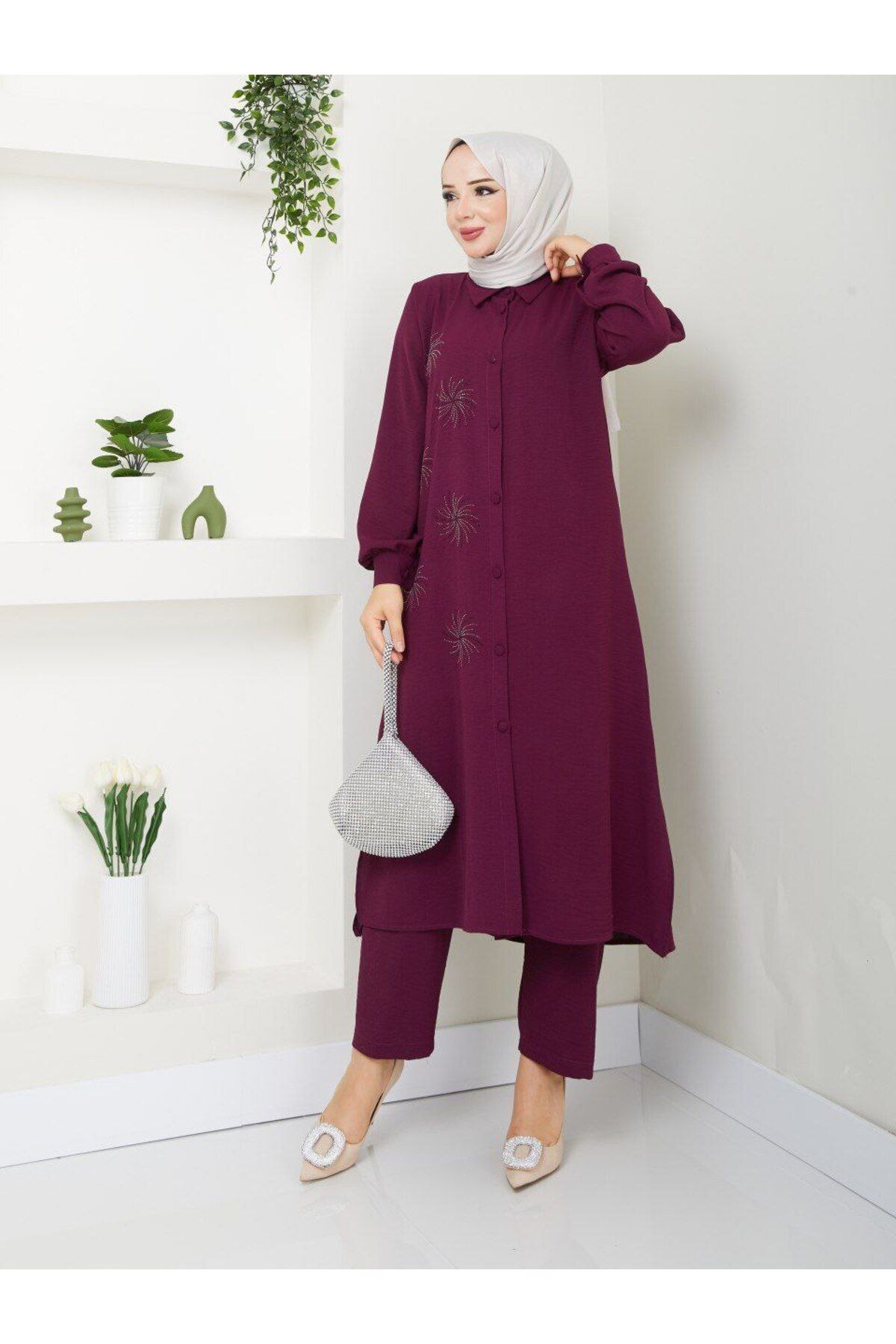 Pul Detaylı Düğmeli Büyük Beden Tunik Gömlek Pantolon Aerobin İkili Takım Pul Detaylı Düğmeli Büyük Beden Tunik Gömlek Pantolon Aerobin İkili Takım Araas01 52