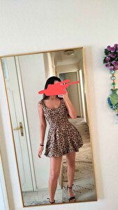Kadın Camel Leopar Desen Askılı Mini Balon Elbise Kadın Camel Leopar Desen Askılı Mini Balon Elbise LEOE35 L