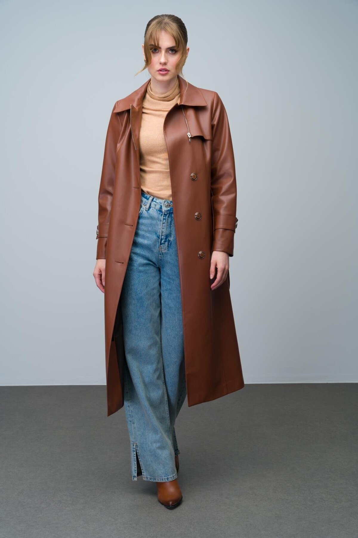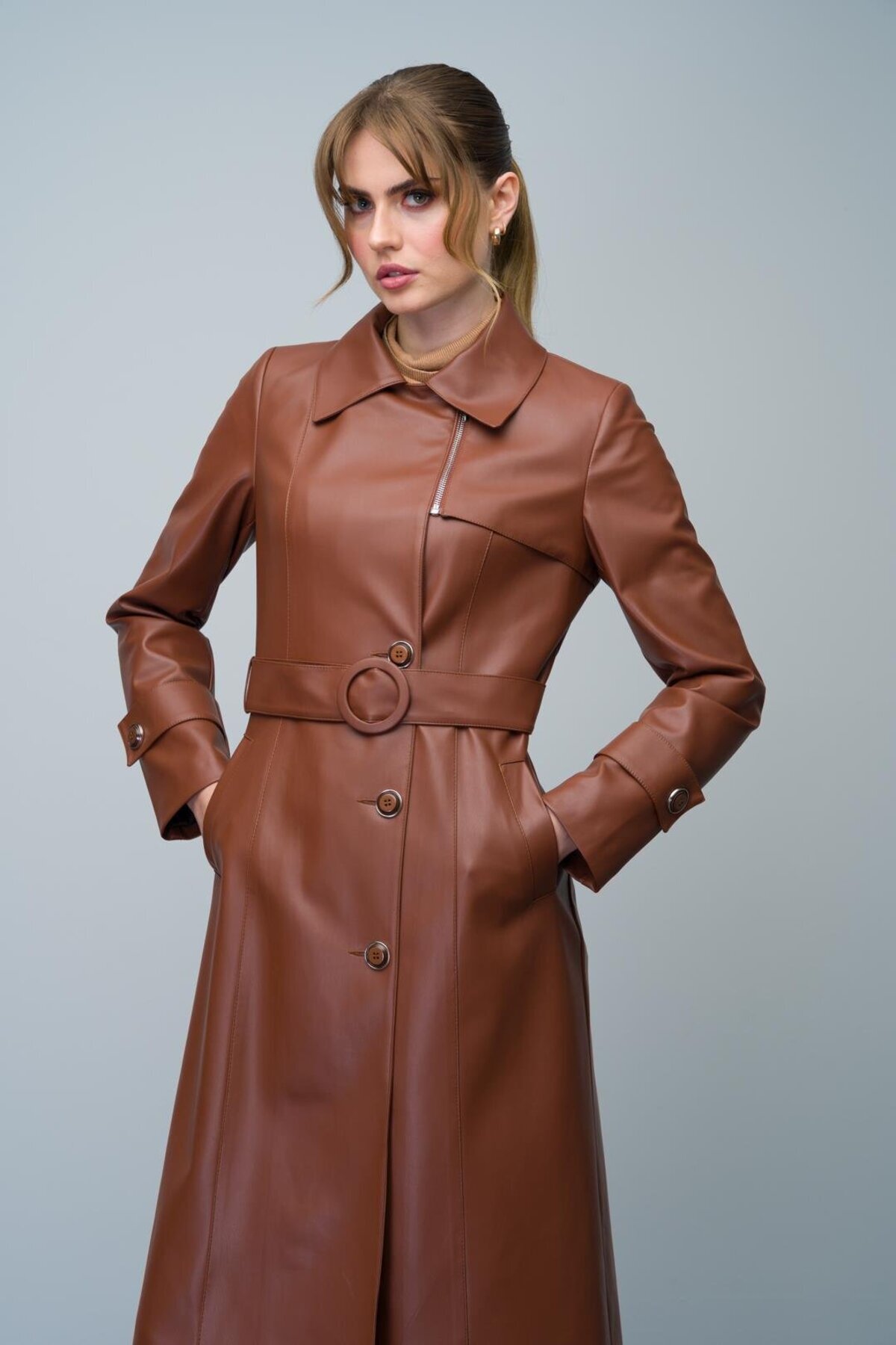 Yakada Fermuar Detaylı Kemer Tokalı Deri Trençkot TABA 6609 Yakada Fermuar Detaylı Kemer Tokalı Deri Trençkot TABA 6609 42