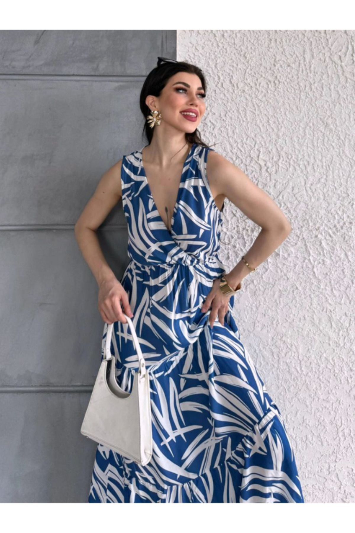 Kadın Santorini Bel Lastikli Mavi Viskon Elbise Kadın Santorini Bel Lastikli Mavi Viskon Elbise 1336 XL