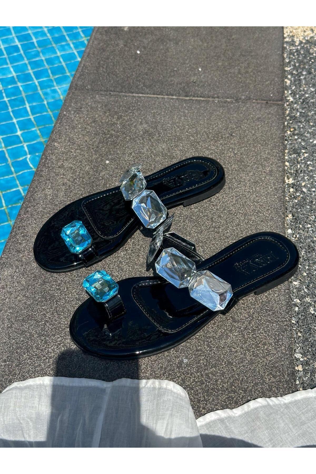 Siyah Rugan (Amber) Taşlı Parmak Arası Kadın Terlik Siyah Rugan (Amber) Taşlı Parmak Arası Kadın Terlik ERV2646 40