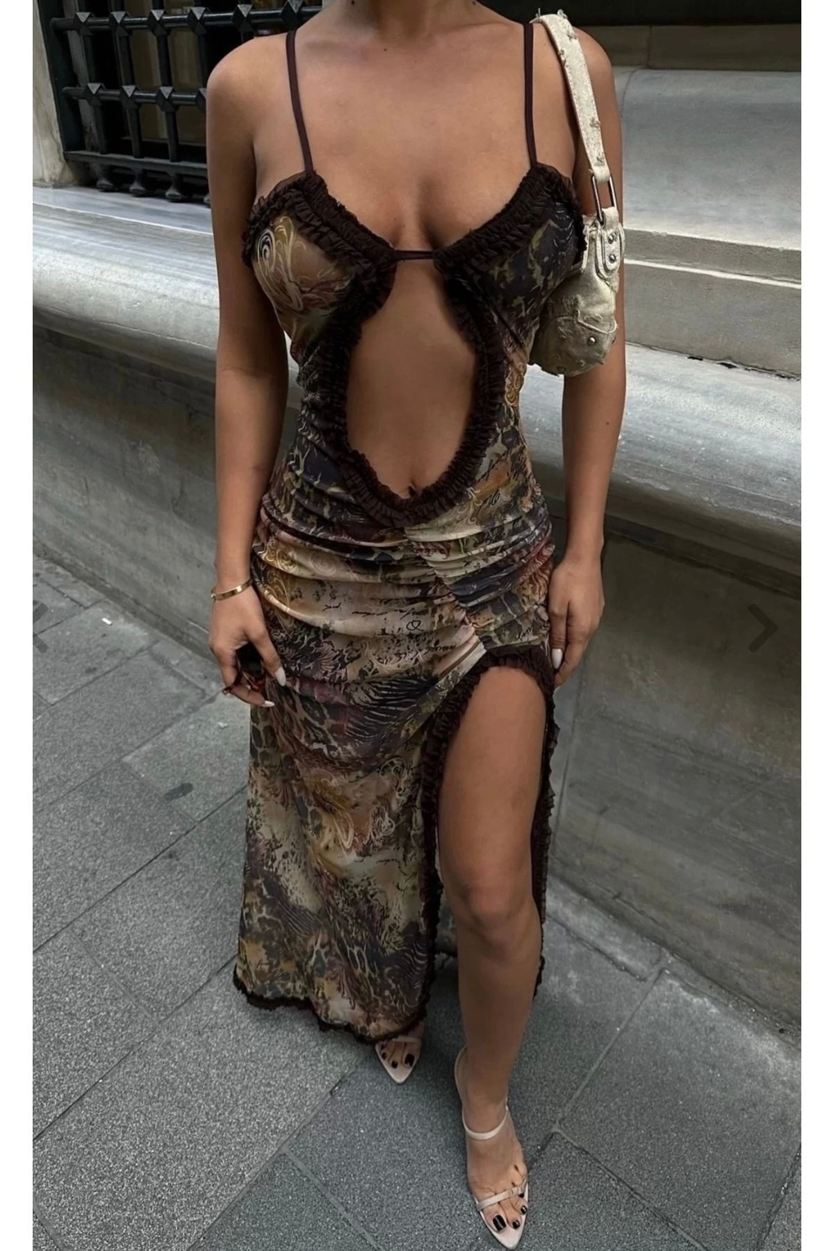 Y2k Desenli Kahve Tül Elbise Y2k Desenli Kahve Tül Elbise mürdüm desen 40