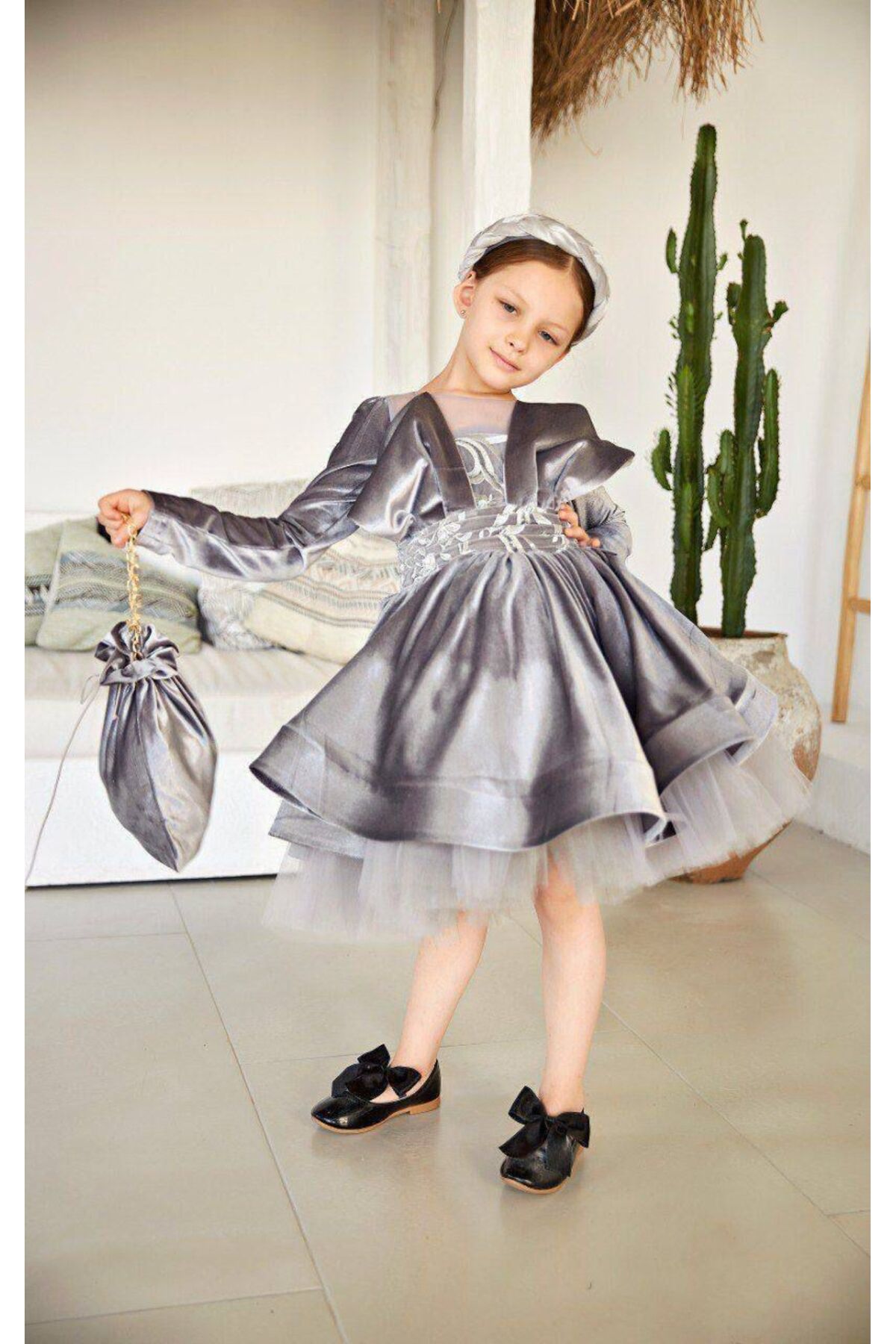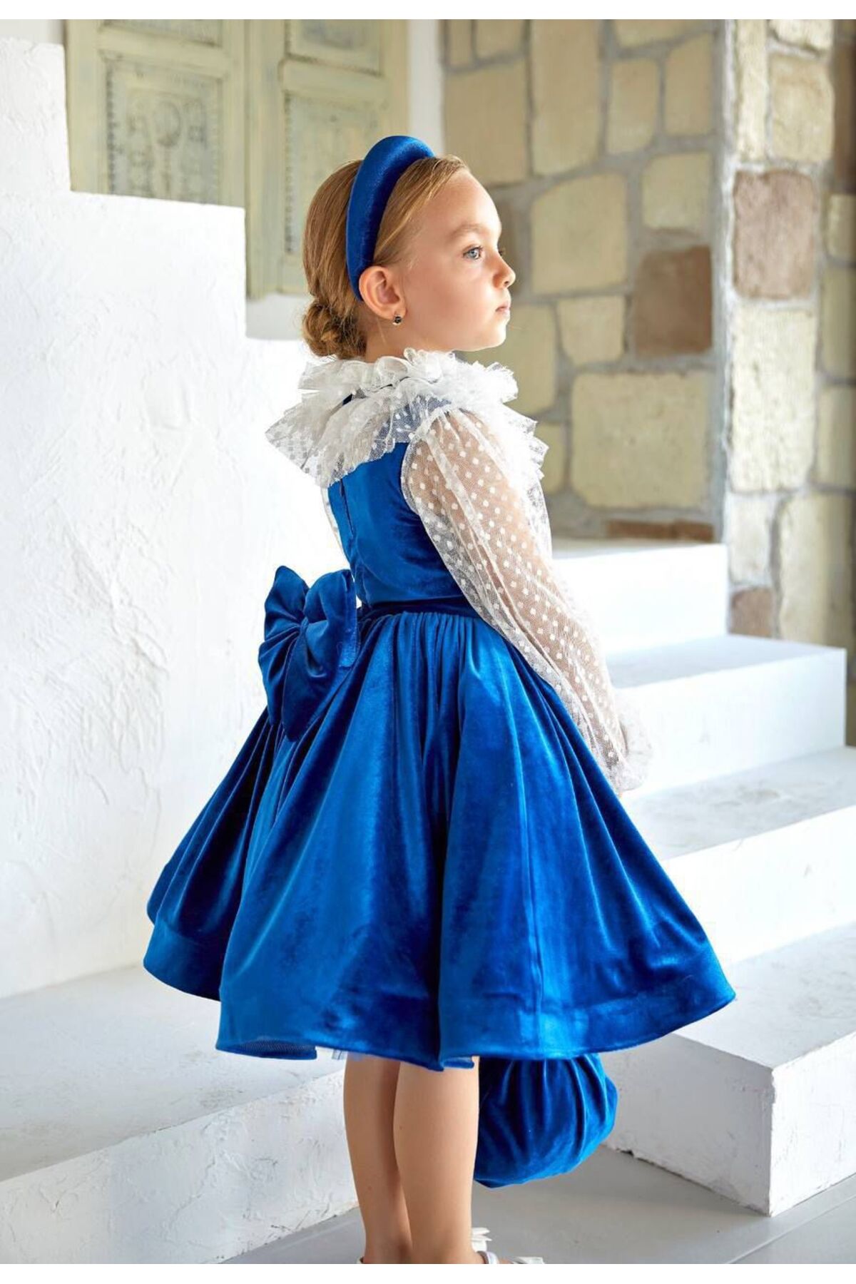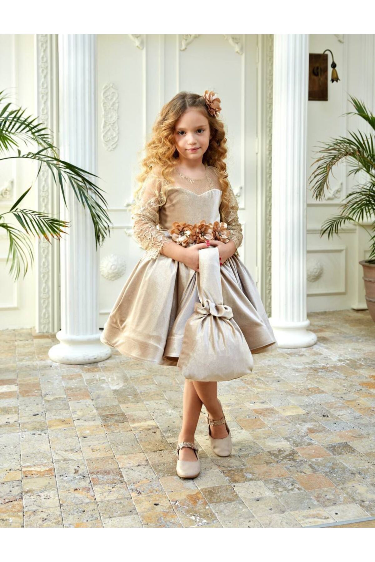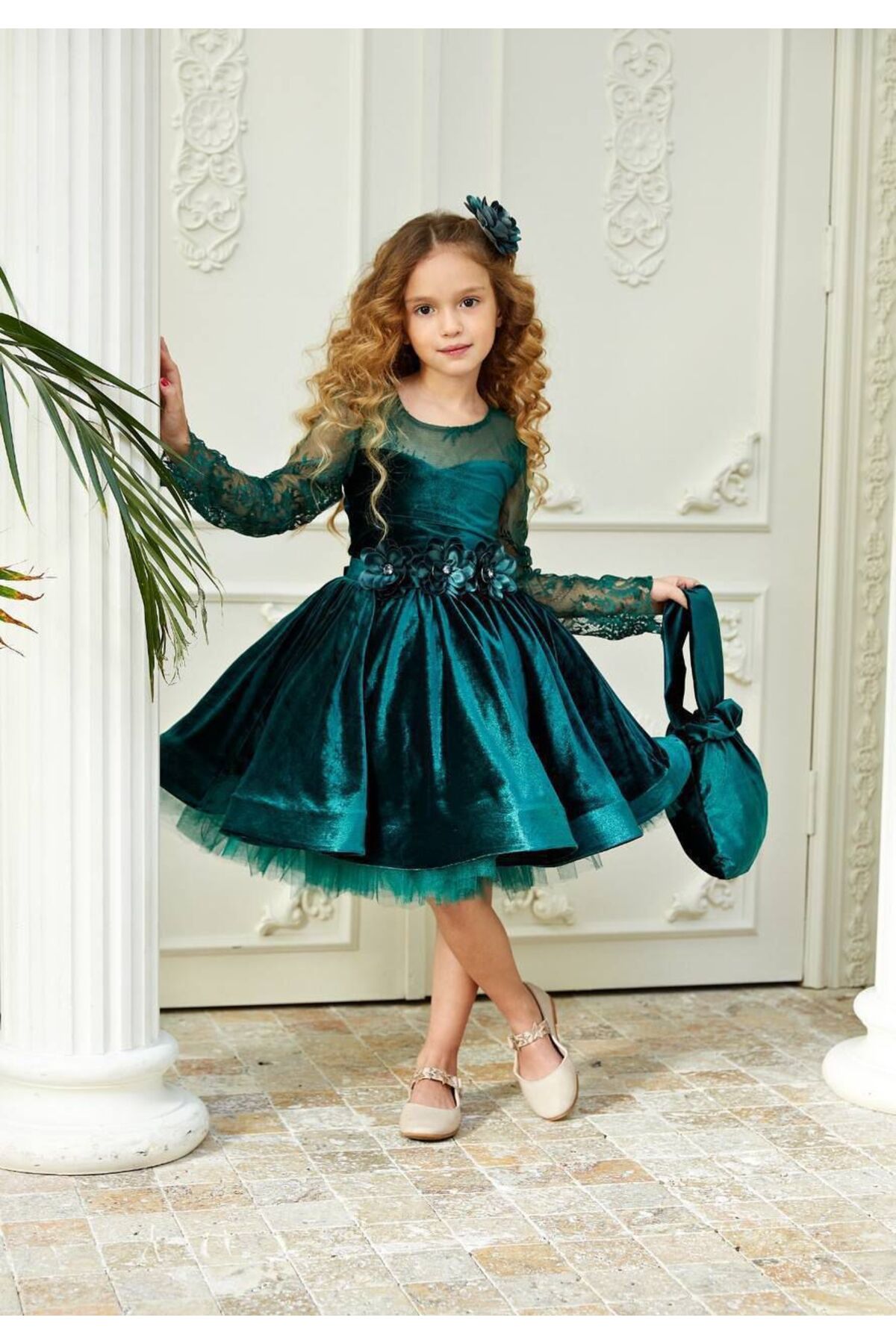 Kolları Tüllü Vintage Kız Çocuk Kadife Elbise Kolları Tüllü Vintage Kız Çocuk Kadife Elbise PT22555 11-12 Yaş