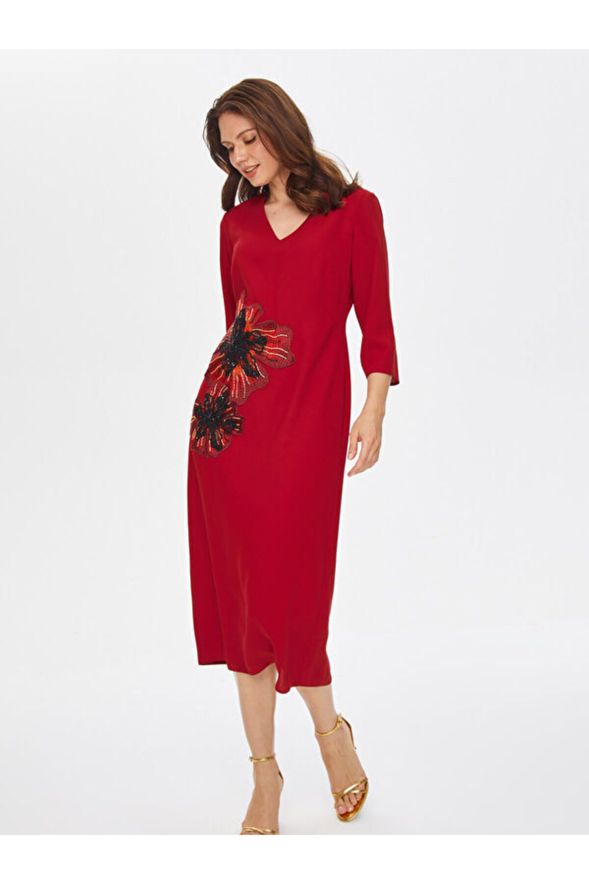 Kolları Boncuk İşli Garnili V Yaka Abiye Elbise 69103 Kolları Boncuk İşli Garnili V Yaka Abiye Elbise 69103 U69103 54