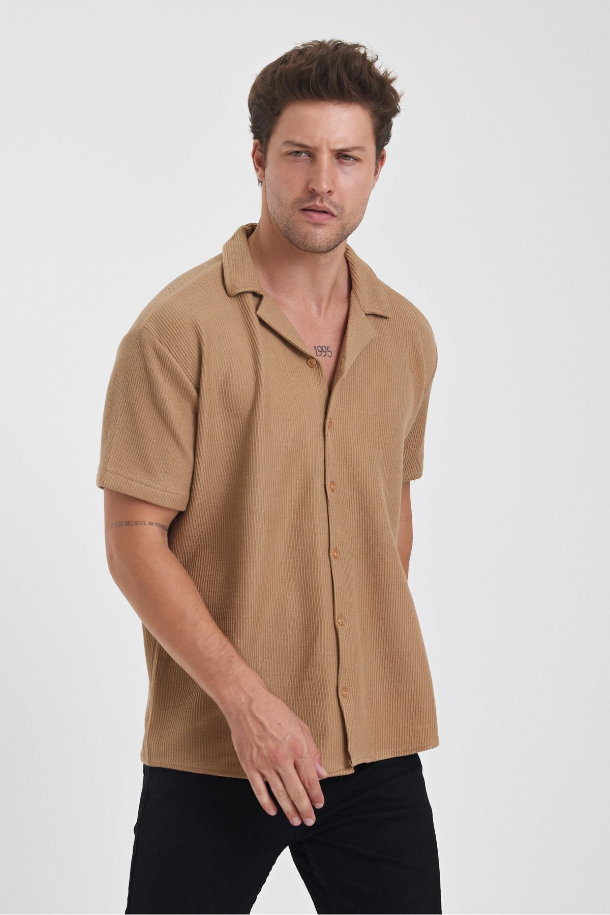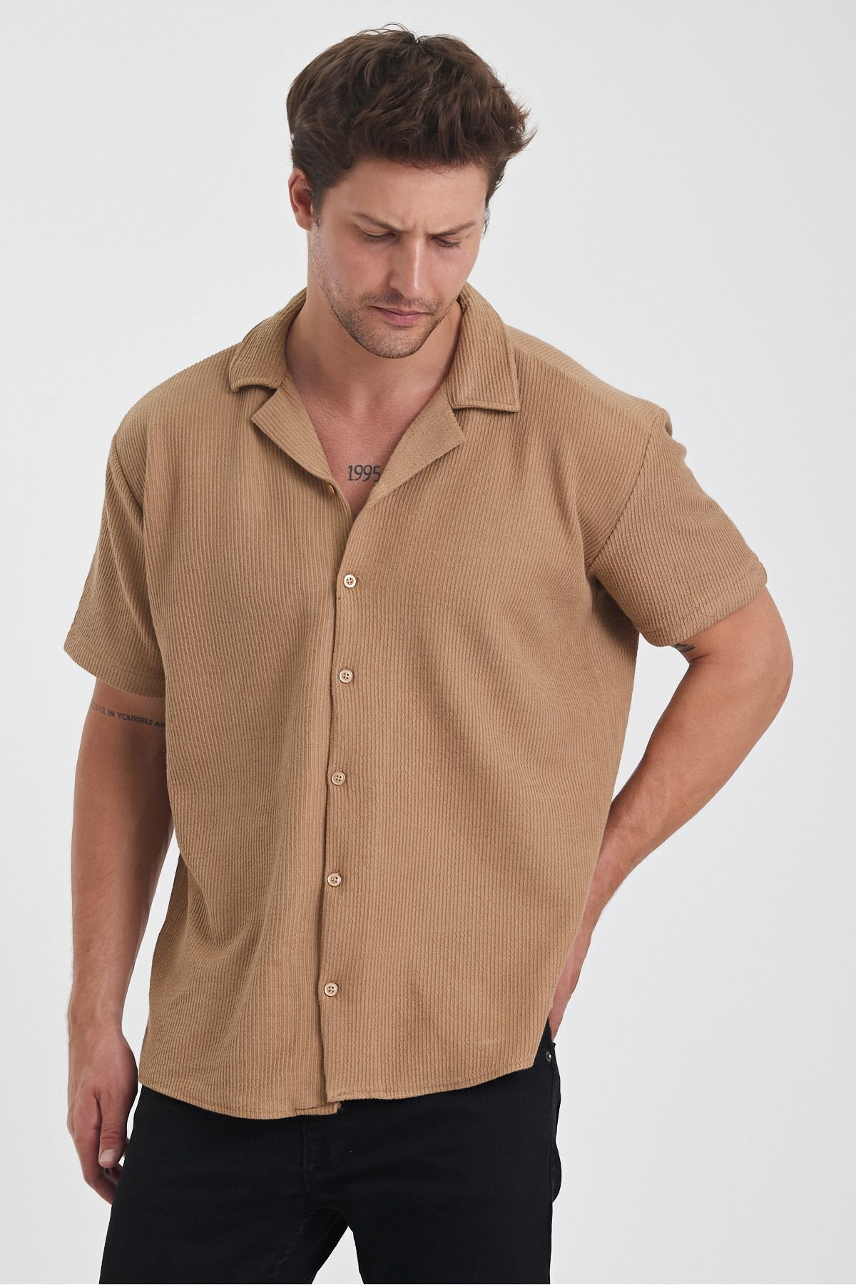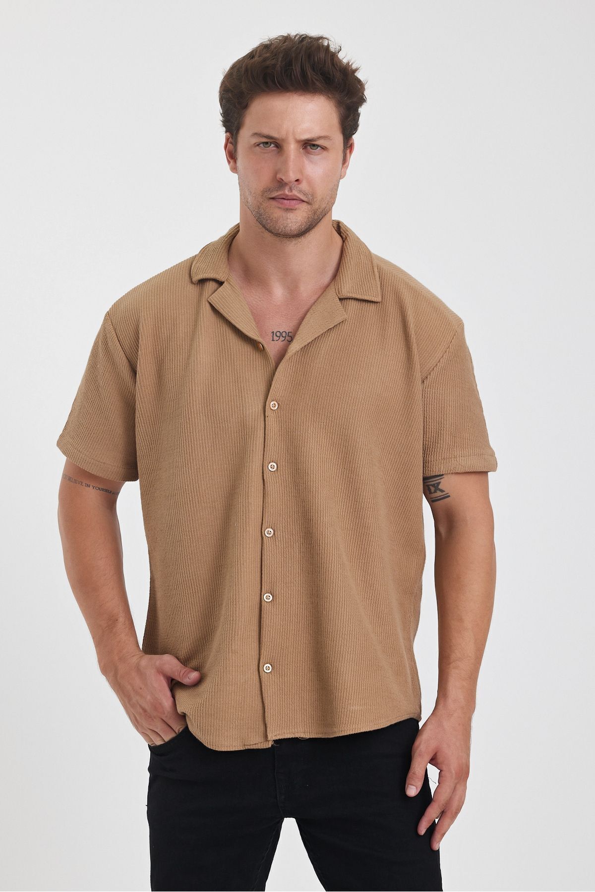 Erkek Pamuklu Esnek Küba Yaka Kısa Kol Gömlek KARAMEL Erkek Pamuklu Esnek Küba Yaka Kısa Kol Gömlek KARAMEL GMLK.0005 S