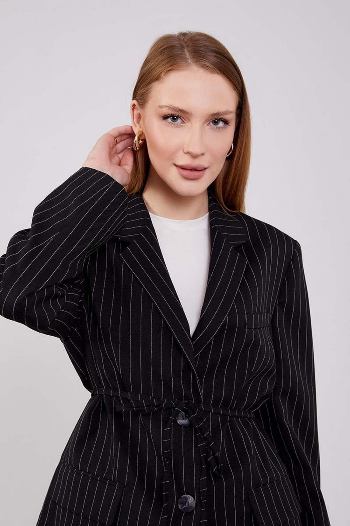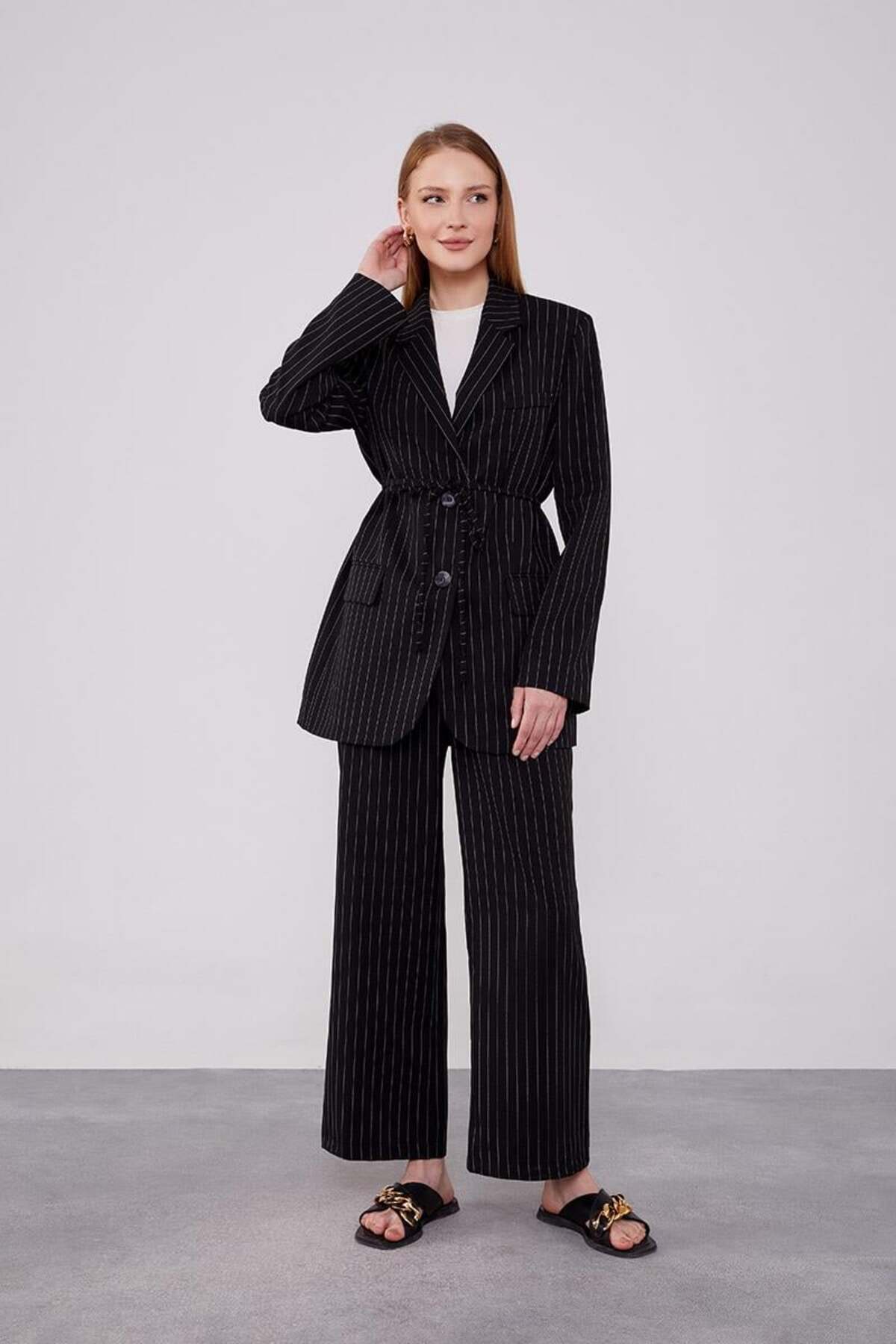 Siyah Belden Bağlamalı Çizgili Pantolonlu Takım Siyah Belden Bağlamalı Çizgili Pantolonlu Takım 100151 44