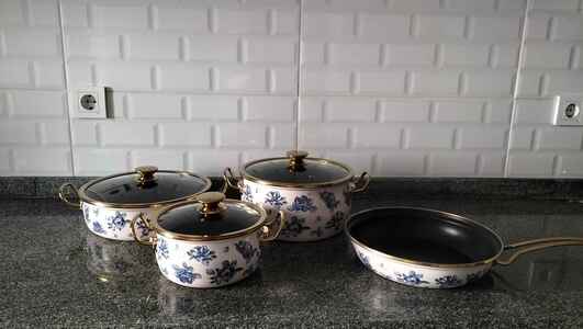 Lilium 7 Parça Mavi Gül Desenli Emaye Tencere & Tava Seti Lilium 7 Parça Mavi Gül Desenli Emaye Tencere & Tava Seti EMY8013 تک سایز
