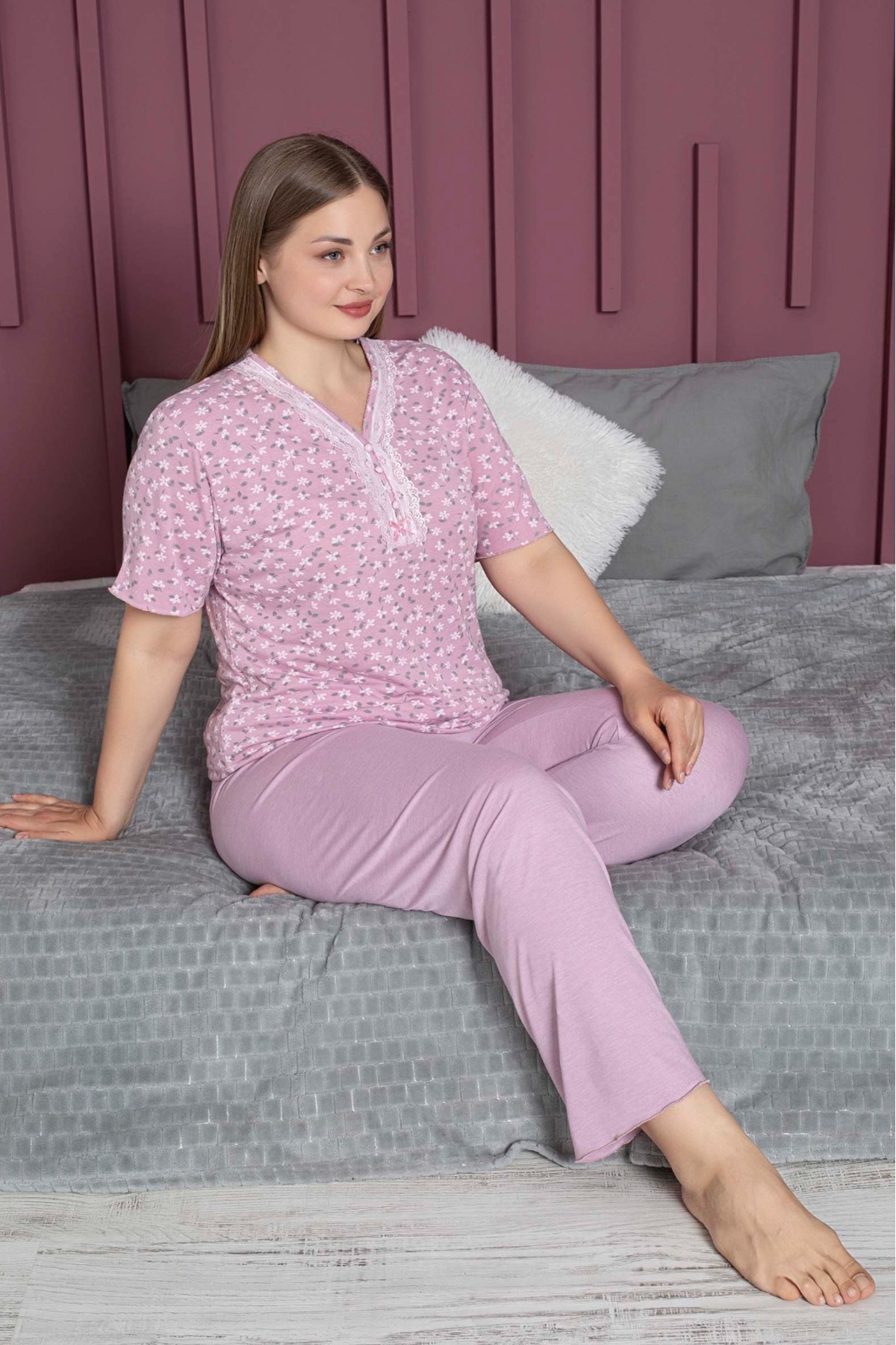 Kadın Büyük Beden Curve Desenli Yakası Dantelli Düğmeli Kısa Kollu Bambu Pijama Takımı Kadın Büyük Beden Curve Desenli Yakası Dantelli Düğmeli Kısa Kollu Bambu Pijama Takımı SDKBMB 6XL