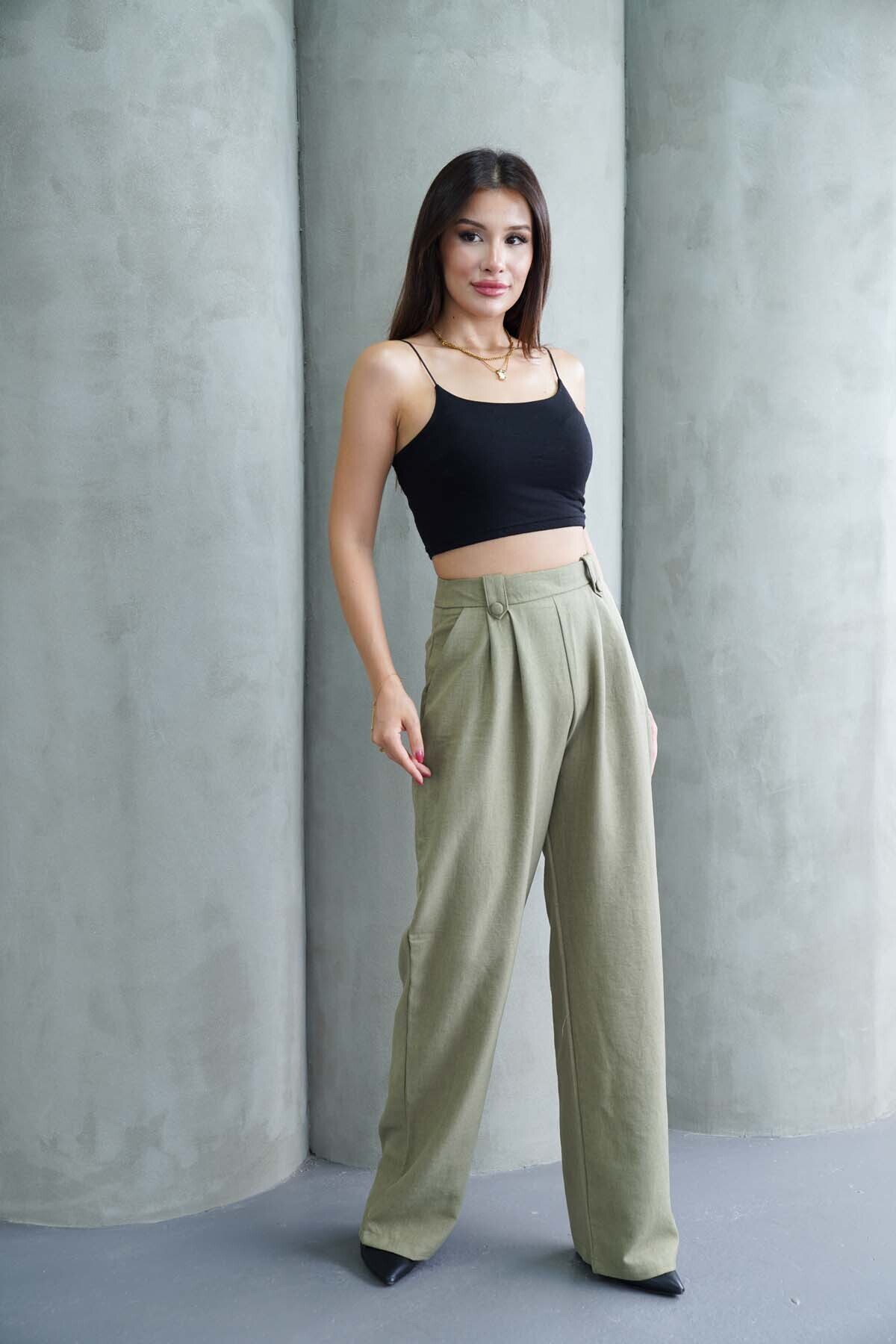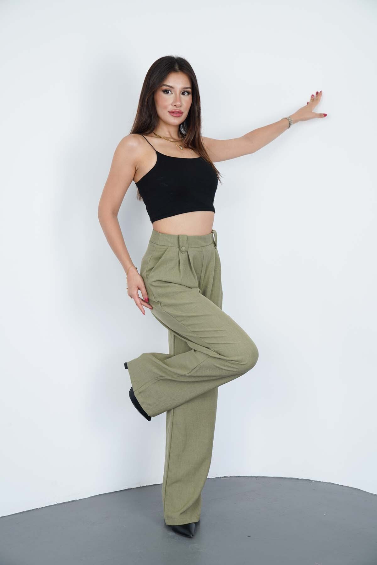 Kadın Haki Keten Düğmeli Yüksek Bel Palazzo Pantolon Kadın Haki Keten Düğmeli Yüksek Bel Palazzo Pantolon PLL2302 46