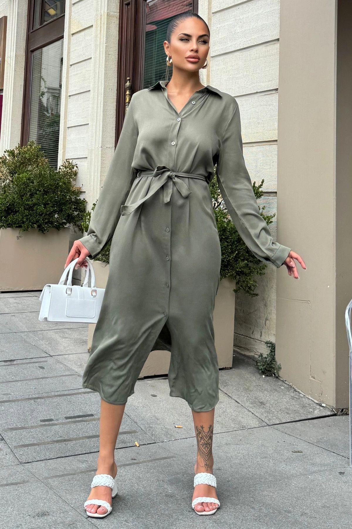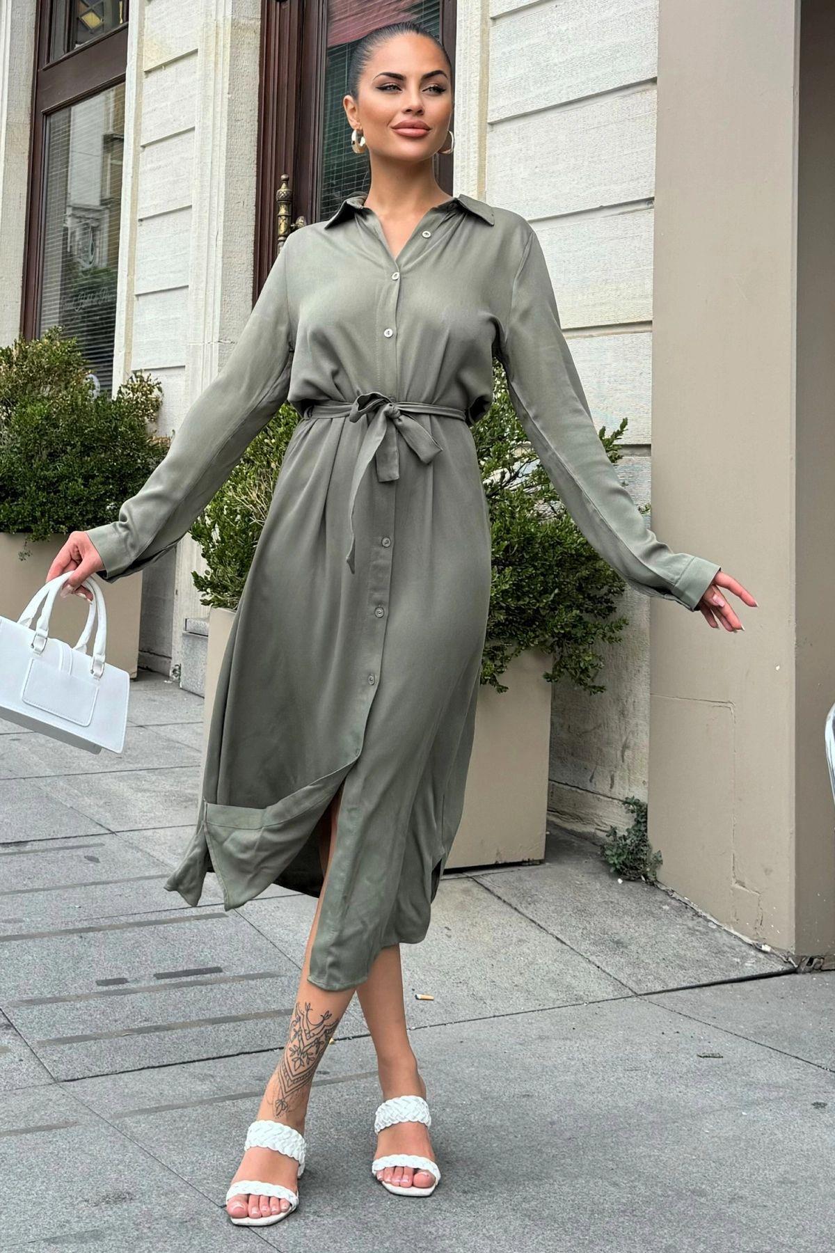 Haki Beli Kuşaklı Viskon Midi Gömlek Elbise Haki Beli Kuşaklı Viskon Midi Gömlek Elbise NYT4011-1490 42
