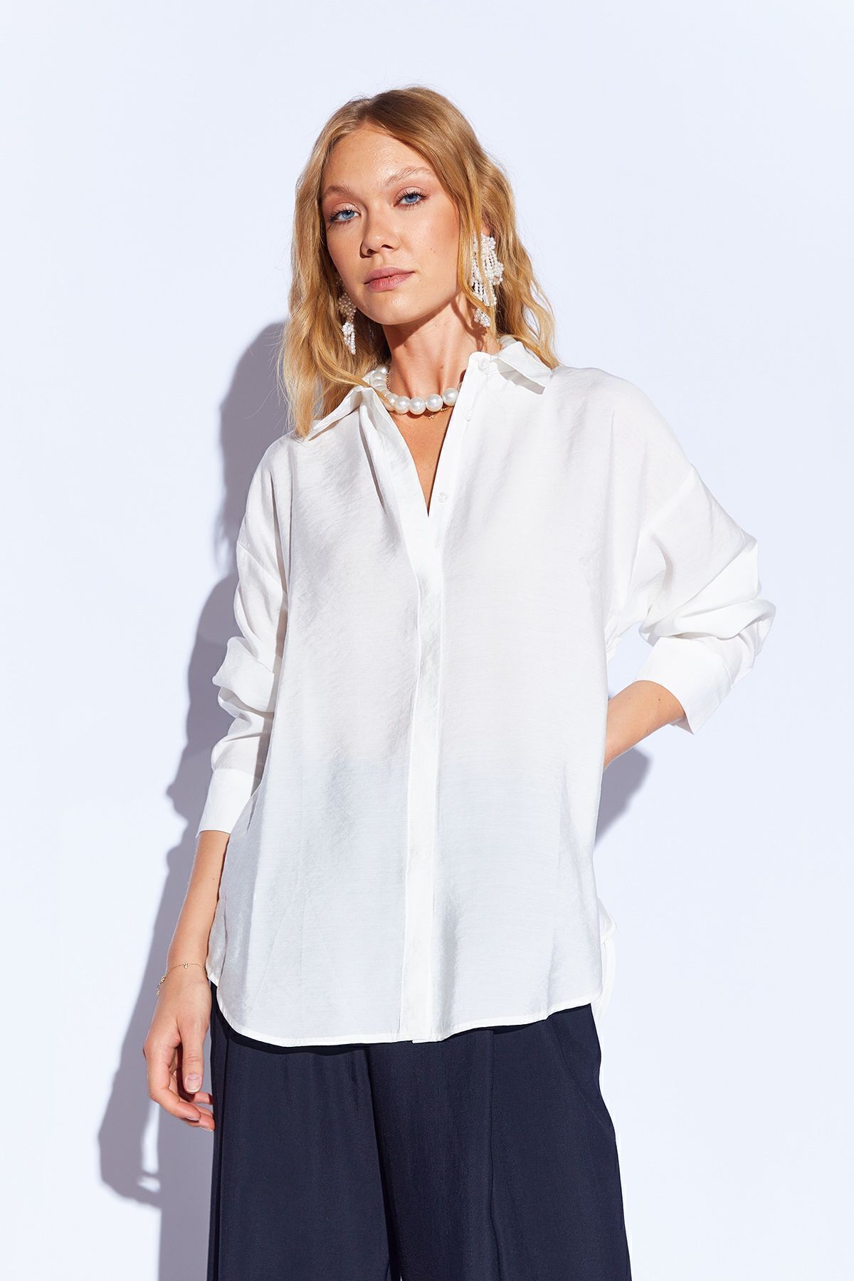 Lacivert Modal Soft Dokulu Yumuşak Gizli Pat Detaylı Oversize Kadın Gömlek - 8262 Lacivert Modal Soft Dokulu Yumuşak Gizli Pat Detaylı Oversize Kadın Gömlek - 8262 EK10008262 L