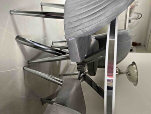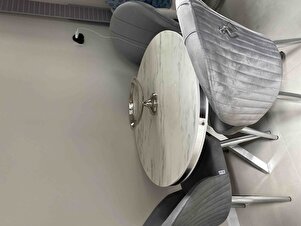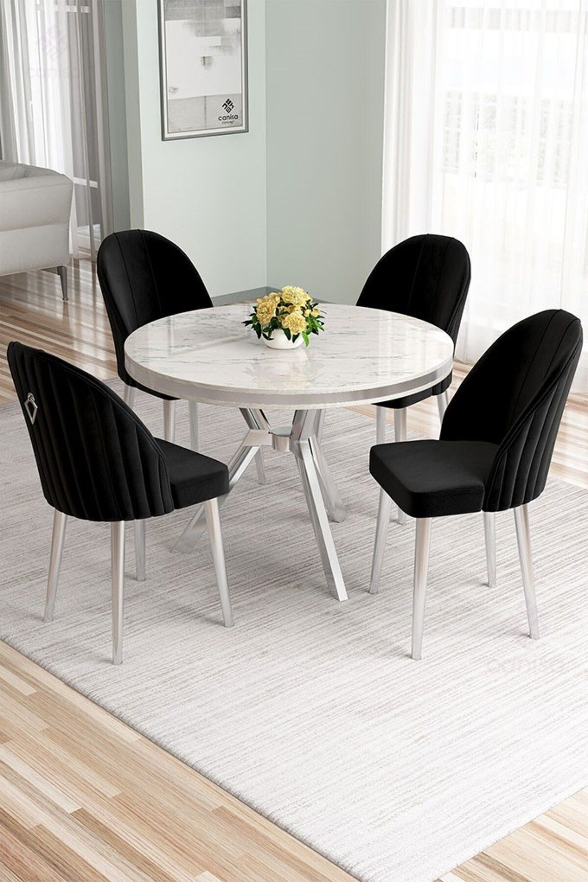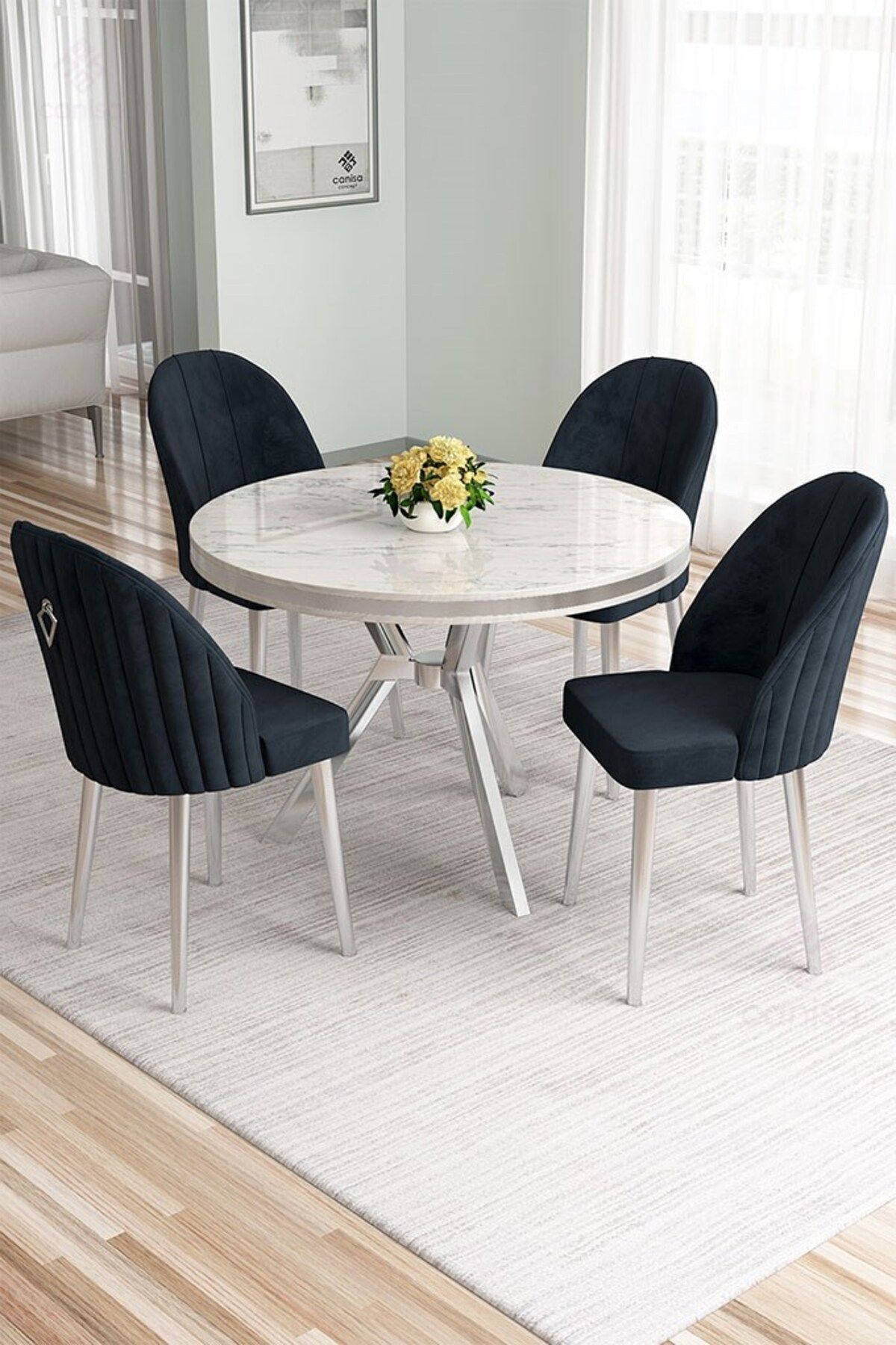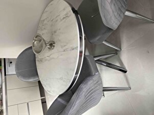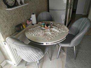Mos Serisi 90x90 Lak Panel Beyaz Mermer Desen Krom Kaplama Mutfak Masası Takımı Ve 4 Gri Sandalye Mos Serisi 90x90 Lak Panel Beyaz Mermer Desen Krom Kaplama Mutfak Masası Takımı Ve 4 Gri Sandalye 22MOS04BYZMR04KRM تک سایز