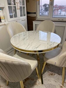 Mos Serisi 90x90 Lak Panel Beyaz Mermer Desen Gold Kaplama Mutfak Masası Takımı Ve 4 Krem Sandalye Mos Serisi 90x90 Lak Panel Beyaz Mermer Desen Gold Kaplama Mutfak Masası Takımı Ve 4 Krem Sandalye 22MOS04BMR04GLD تک سایز