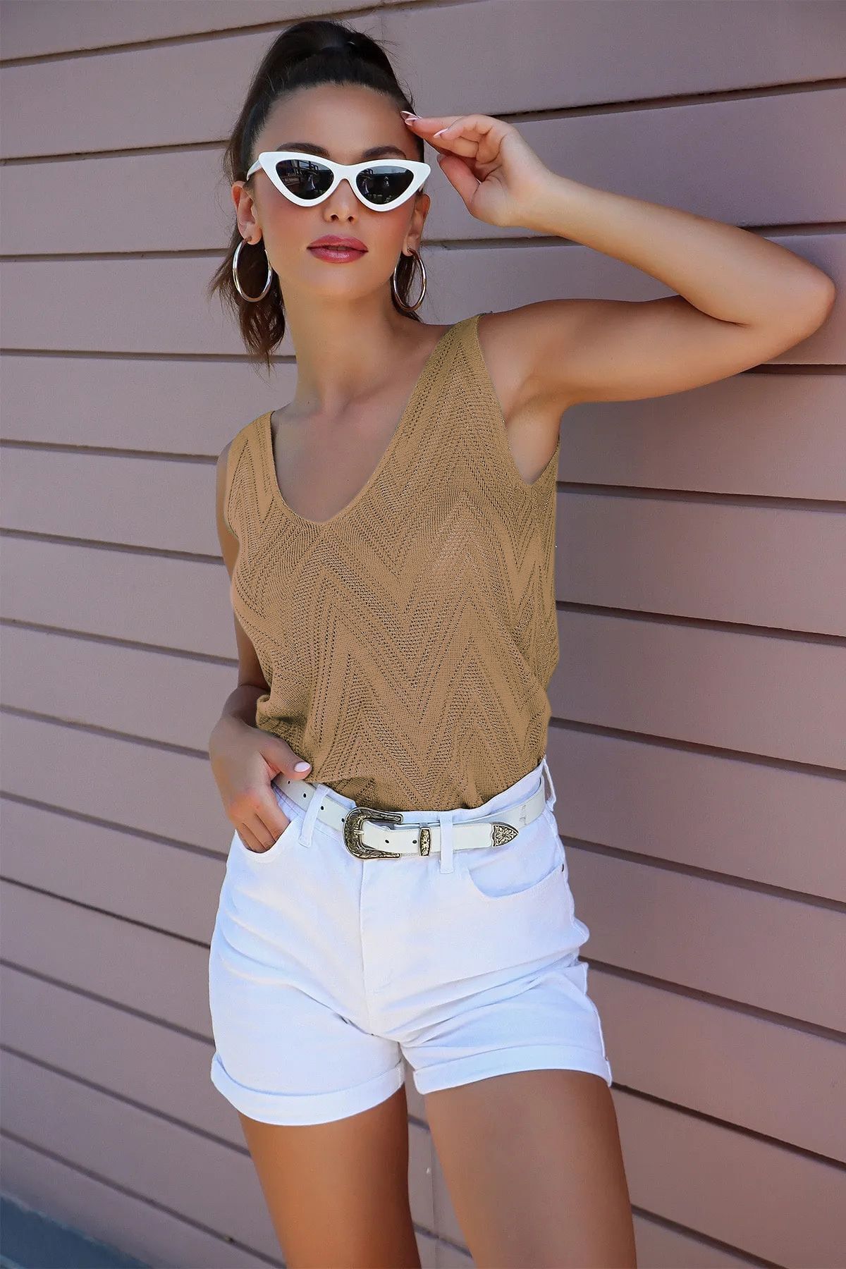 Kadın Ön Arka V Yaka Kolsuz Askılı Sim Detaylı Camel Bluz Kadın Ön Arka V Yaka Kolsuz Askılı Sim Detaylı Camel Bluz CS-22113 XL
