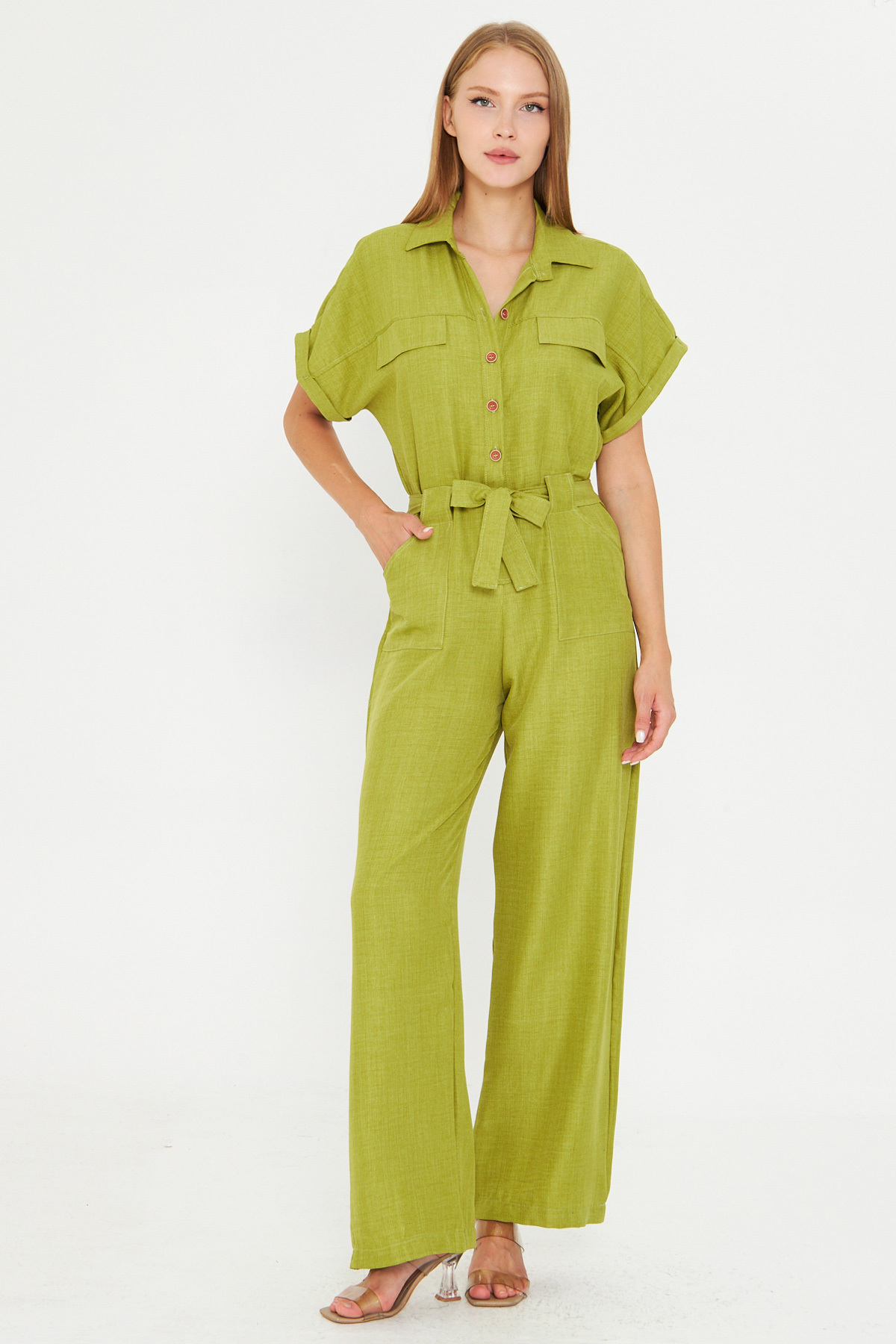 Kadın Siyah Önden Düğmeli Beli Kuşaklı Cepli Yarasa Kol Palazzo Tulum ARM-24Y001105 Kadın Siyah Önden Düğmeli Beli Kuşaklı Cepli Yarasa Kol Palazzo Tulum ARM-24Y001105 XL