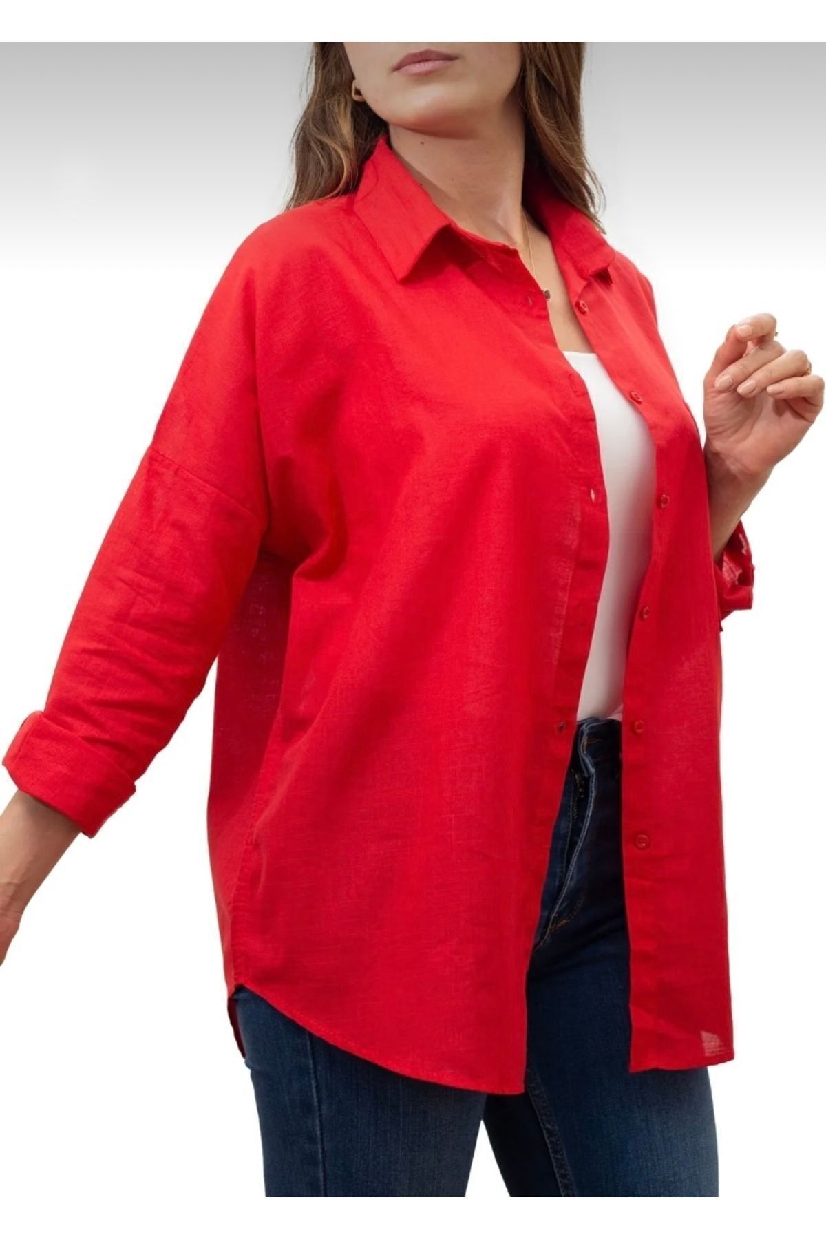 Kadın Kırmızı Keten Ayrobin Kumaş Dokulu Arkası Uzun ve Pileli Oversize Salaş Gömlek 5042 Kadın Kırmızı Keten Ayrobin Kumaş Dokulu Arkası Uzun ve Pileli Oversize Salaş Gömlek 5042 MXDTGMLK5042 Standart