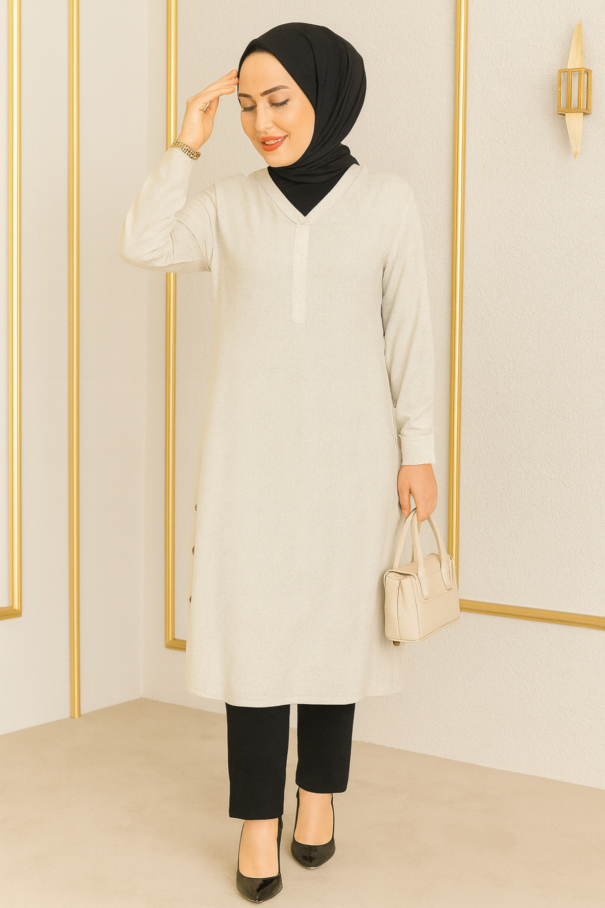 Kadın Keten Yırtmaçlı Düğme Desenli Tunik Kadın Keten Yırtmaçlı Düğme Desenli Tunik GNŞBDNTNK2764 42