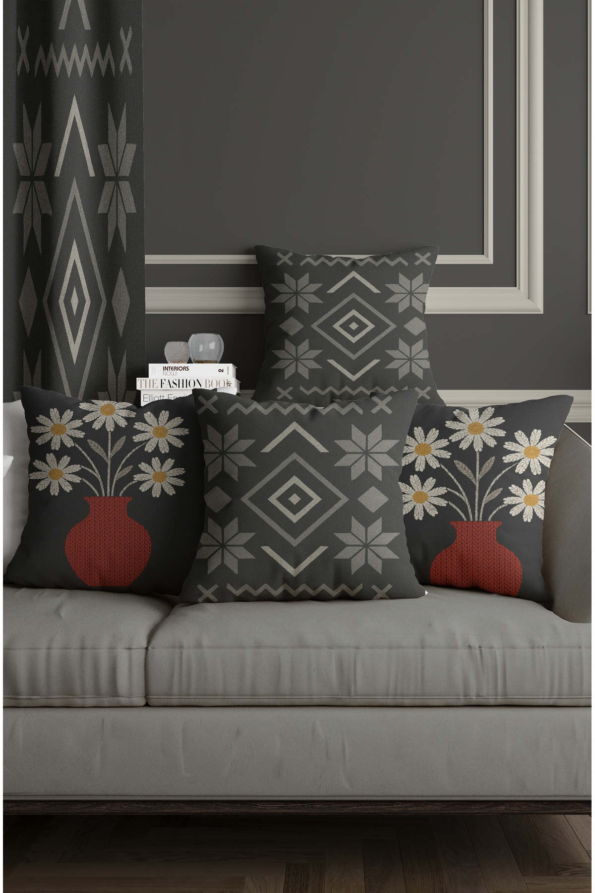 Siyah, Gri Renkli Bohem Stil Yaprak Desenli Çift Taraflı Djital Baskılı 4'lü Kırlent Kılıfı Siyah, Gri Renkli Bohem Stil Yaprak Desenli Çift Taraflı Djital Baskılı 4'lü Kırlent Kılıfı bhmsygr121 43 x 43