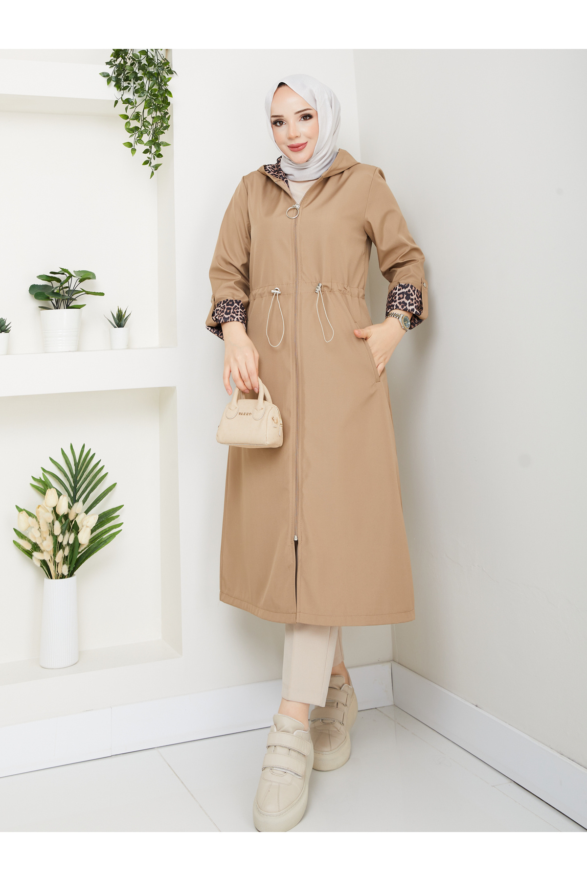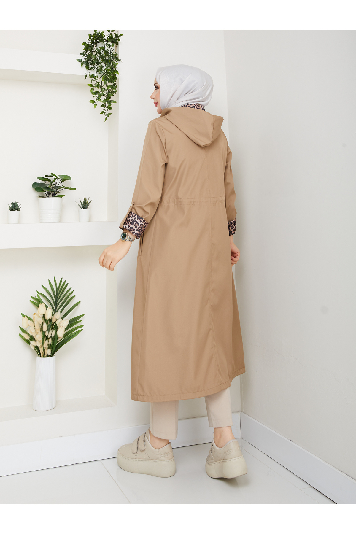 Leopar Desenli Bondit Kumaş Beli Lastikli Kapşonlu Su Geçirmez Trençkot RC1205010 Leopar Desenli Bondit Kumaş Beli Lastikli Kapşonlu Su Geçirmez Trençkot RC1205010 42