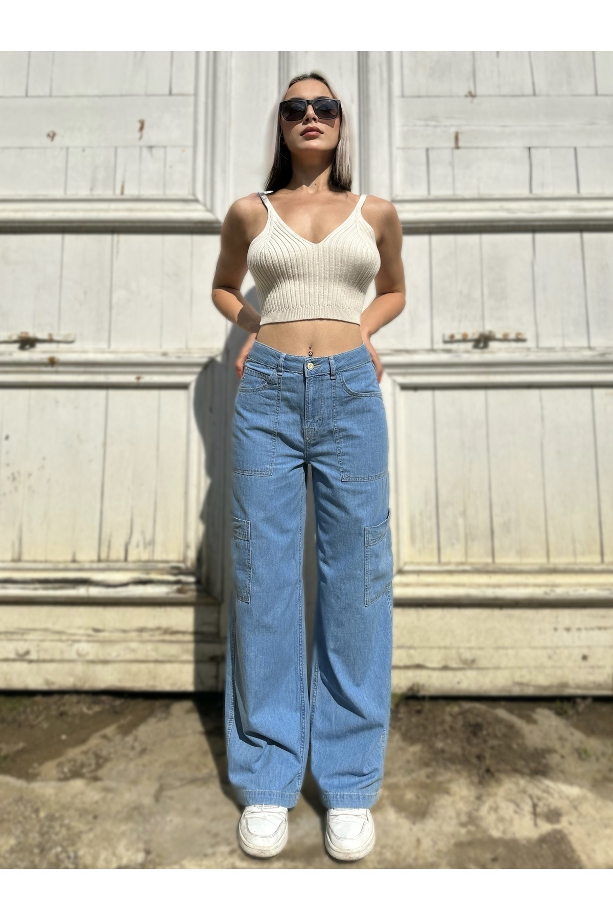 Kadın Kargo Cep Yüksek Bel Palazzo Salaş Kalıp Denim Pantolon Kadın Kargo Cep Yüksek Bel Palazzo Salaş Kalıp Denim Pantolon ECK5242 36