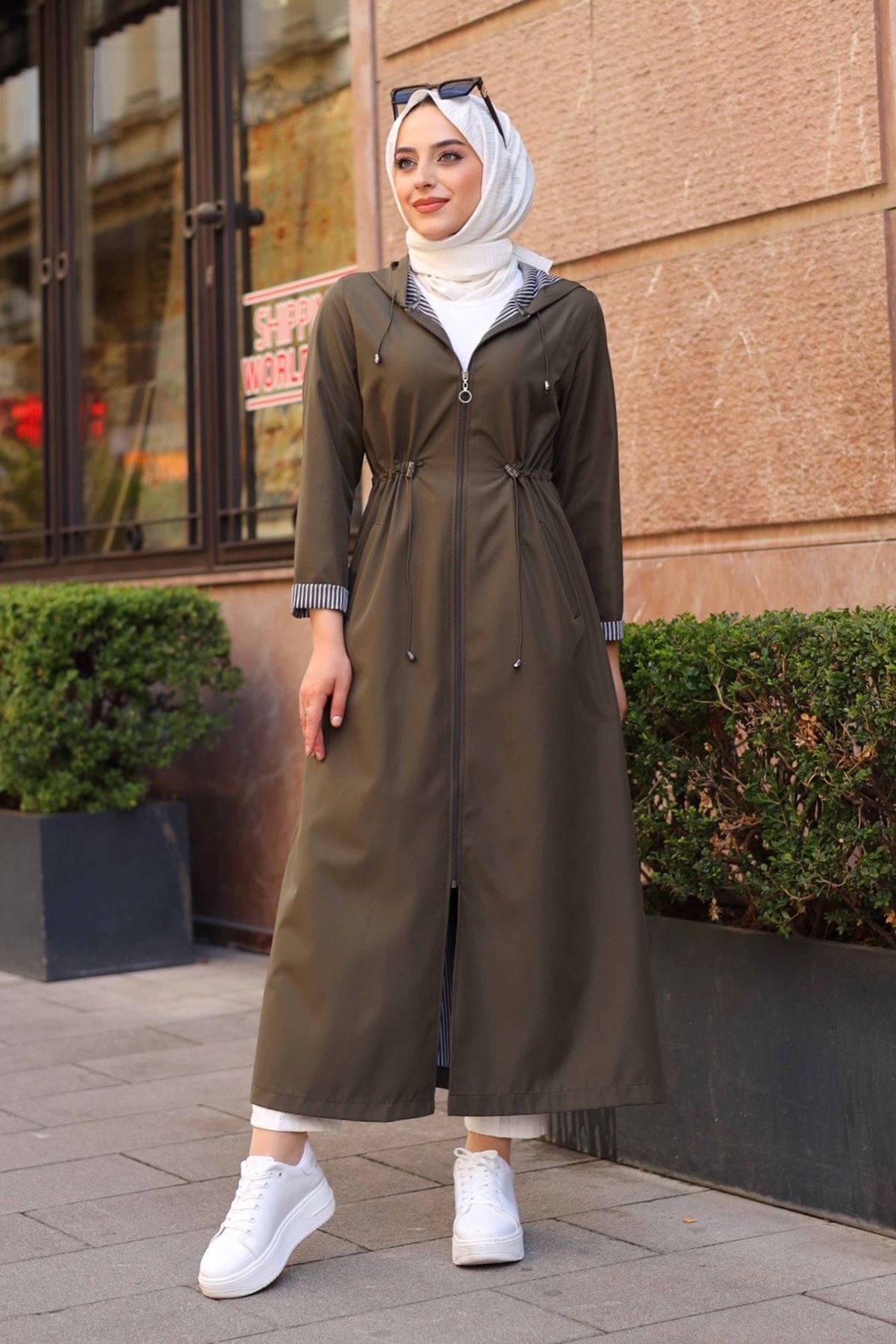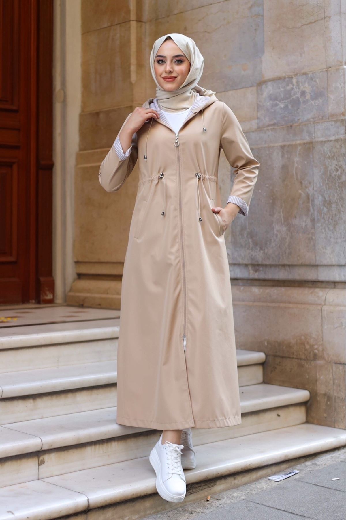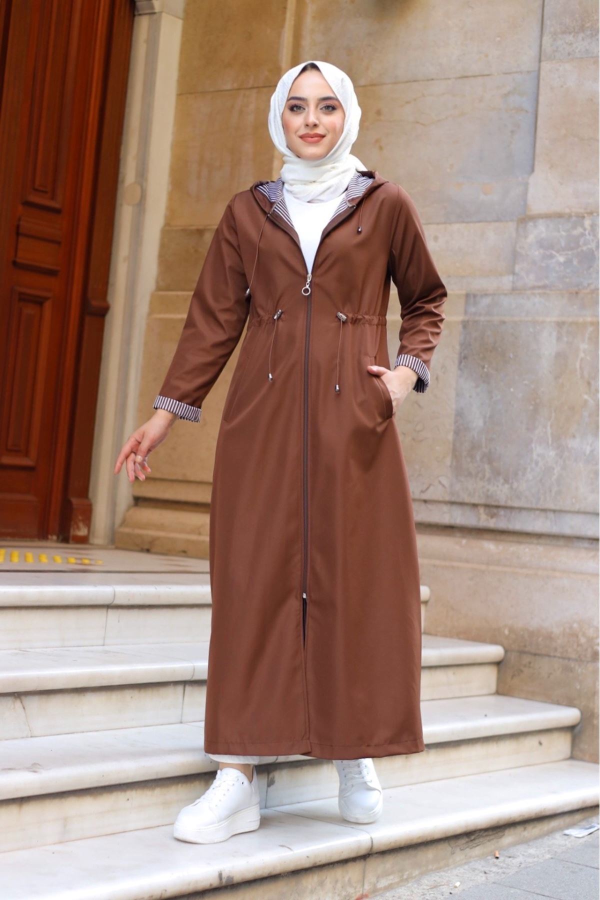Bileği ve İçi Çizgili Kapüşonlu Tam Boy Uzun Trençkot Bileği ve İçi Çizgili Kapüşonlu Tam Boy Uzun Trençkot BC60 42