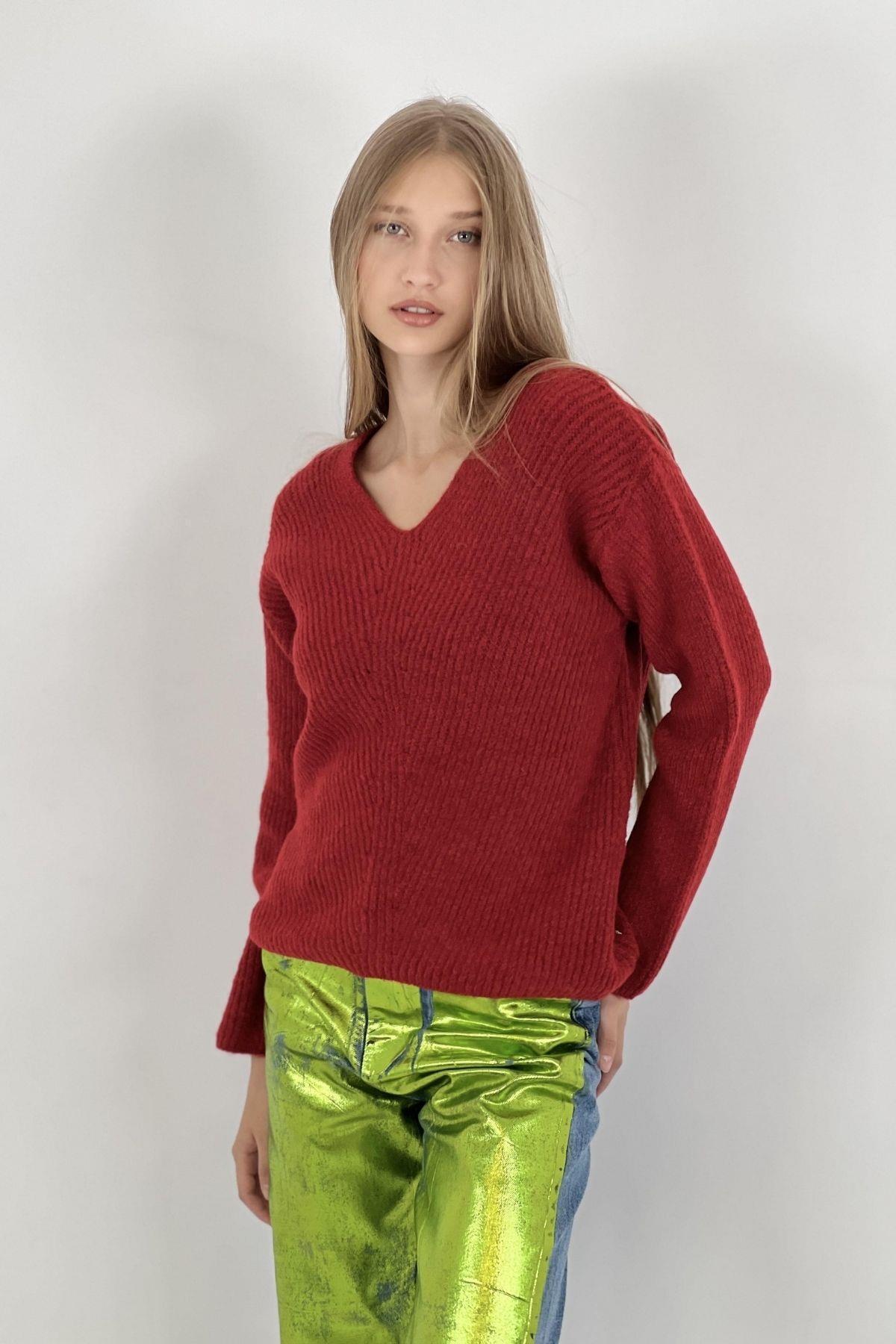 Kadın V Yaka Kışlık Uzun Oversize Kırmızı Triko Kazak Kadın V Yaka Kışlık Uzun Oversize Kırmızı Triko Kazak 24K0133207 M/L
