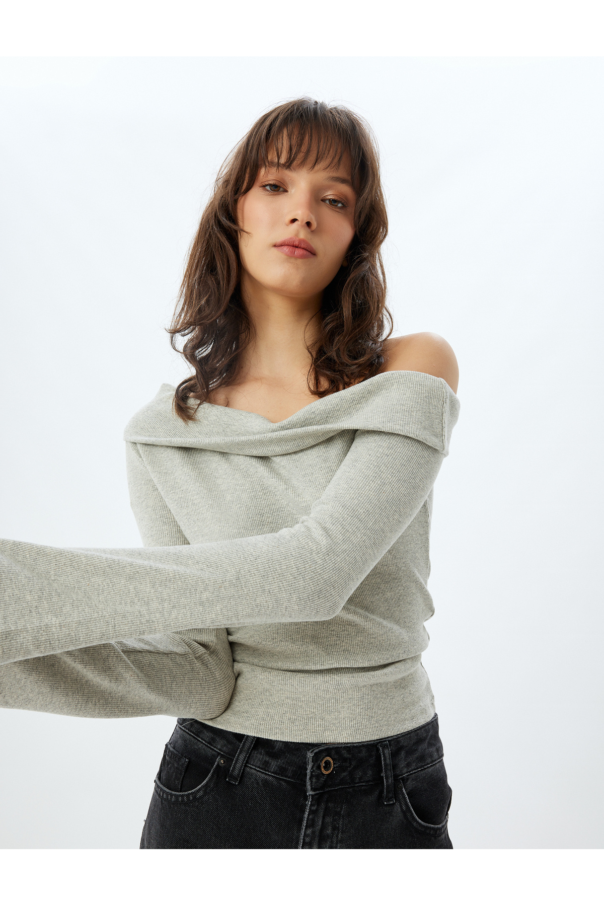 Madonna Yaka Omzu Açık Tişört Kat Detaylı Fitilli Uzun Kollu Slim Fit Madonna Yaka Omzu Açık Tişört Kat Detaylı Fitilli Uzun Kollu Slim Fit 5WAK50159EK XL