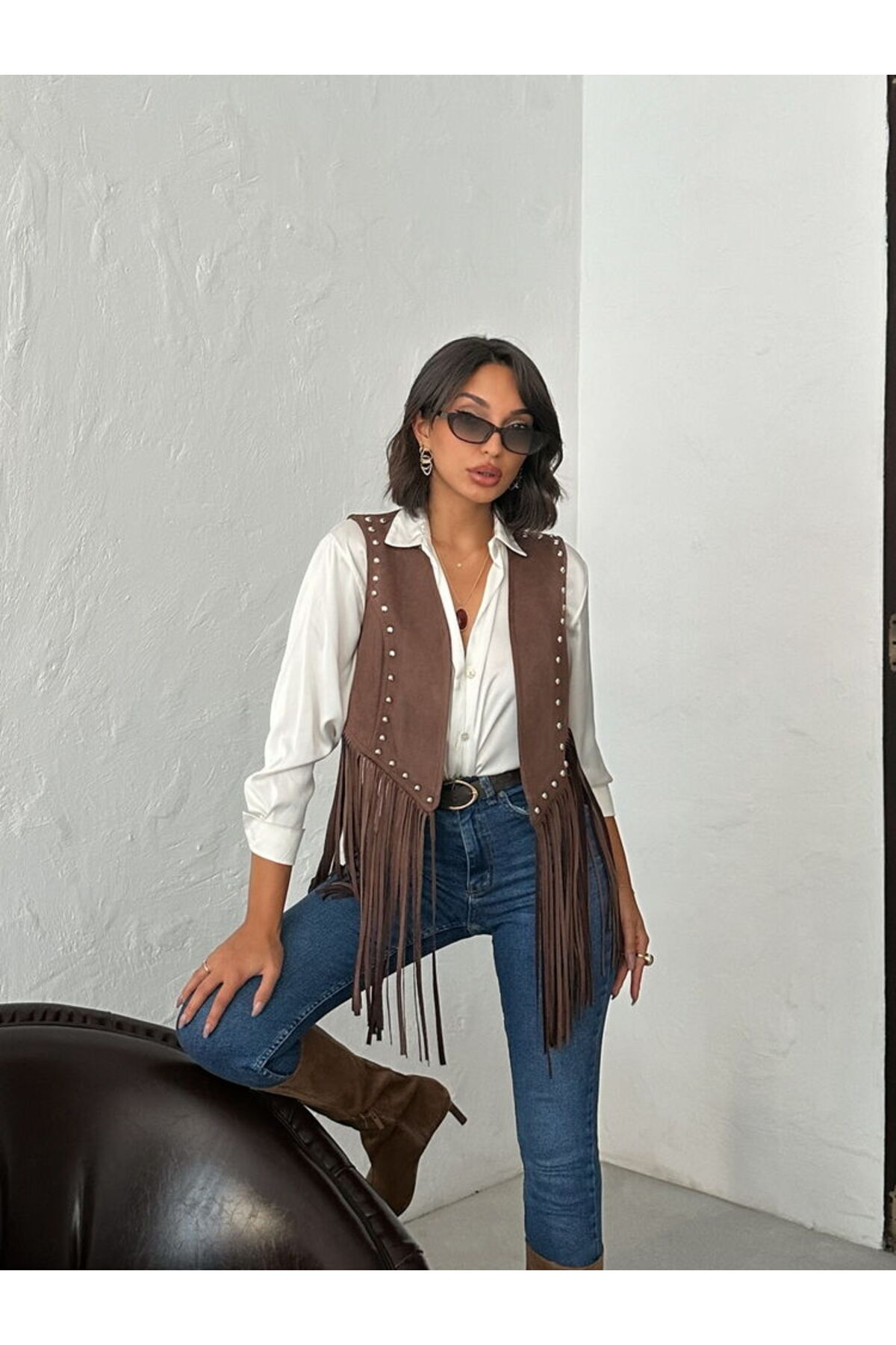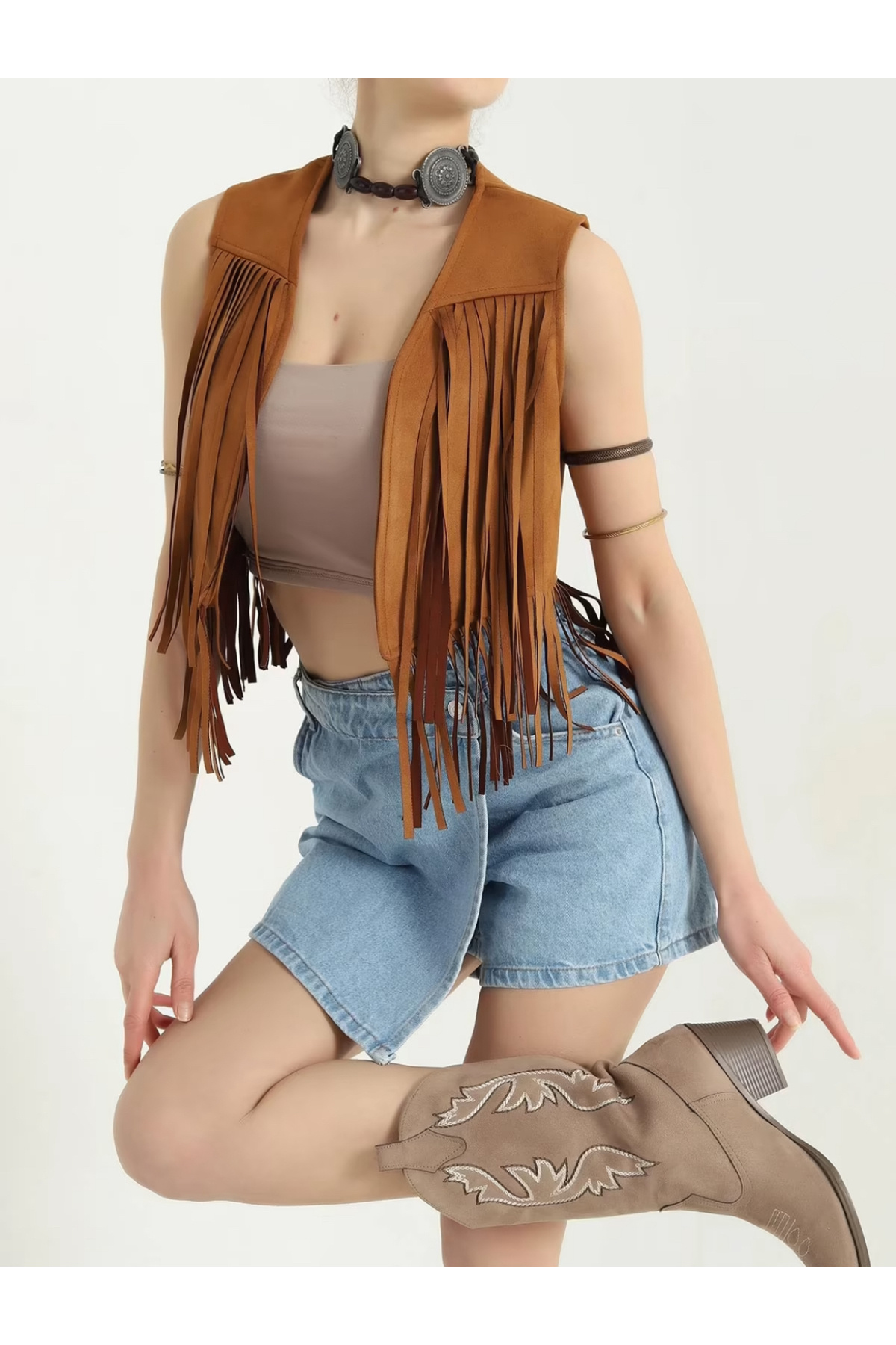Crop Boy Rahat Kalıp Püsküllü Suni Süet Yelek Crop Boy Rahat Kalıp Püsküllü Suni Süet Yelek 5WAK20235EW 42