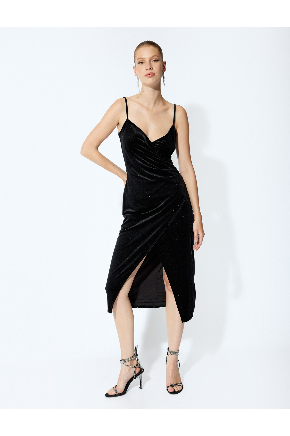 Kadife Midi Yırtmaç Detaylı Drapeli Askılı Elbise Kadife Midi Yırtmaç Detaylı Drapeli Askılı Elbise 5WAK80021FK XL