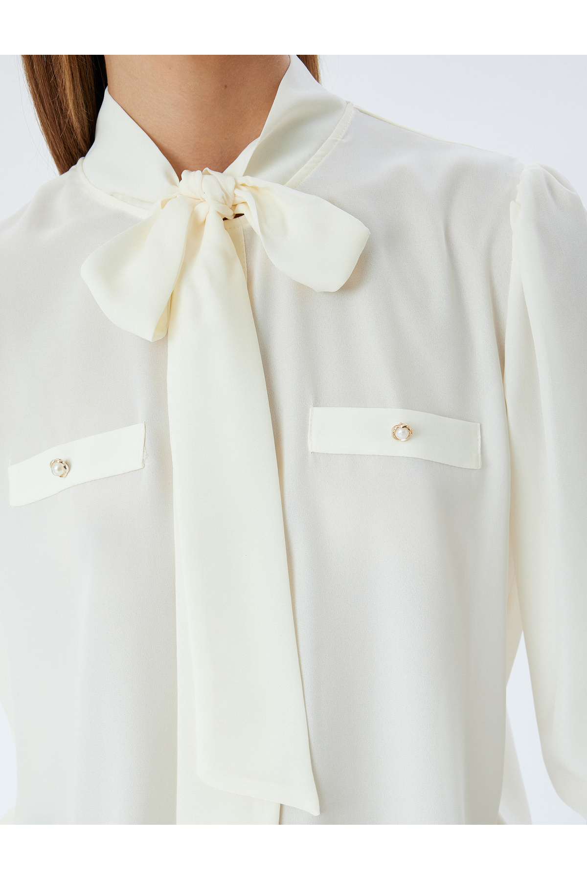 Uzun Kollu Fular Yaka İnci Düğme Detaylı Krep Gömlek Uzun Kollu Fular Yaka İnci Düğme Detaylı Krep Gömlek 4SAK60337UW 44