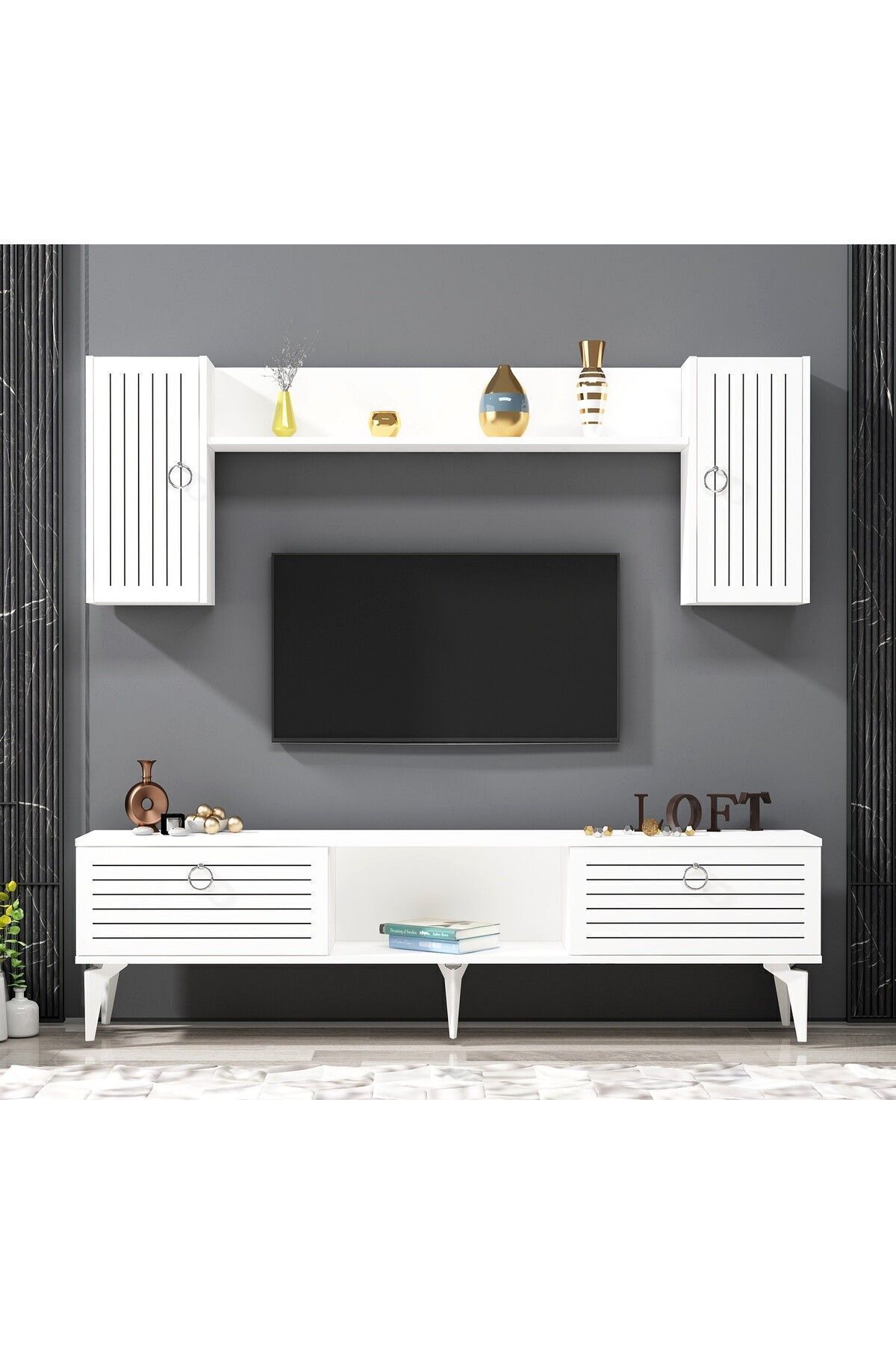 ASELDH TV ÜNİTESİ TAKIMI BEYAZ-GÜMÜŞ ASELDH TV ÜNİTESİ TAKIMI BEYAZ-GÜMÜŞ ASELTVTDH تک سایز