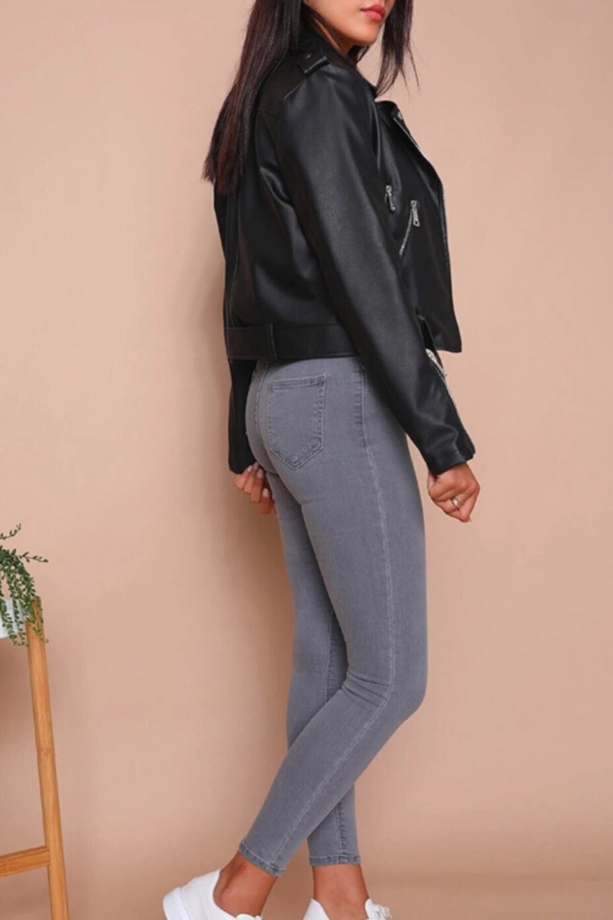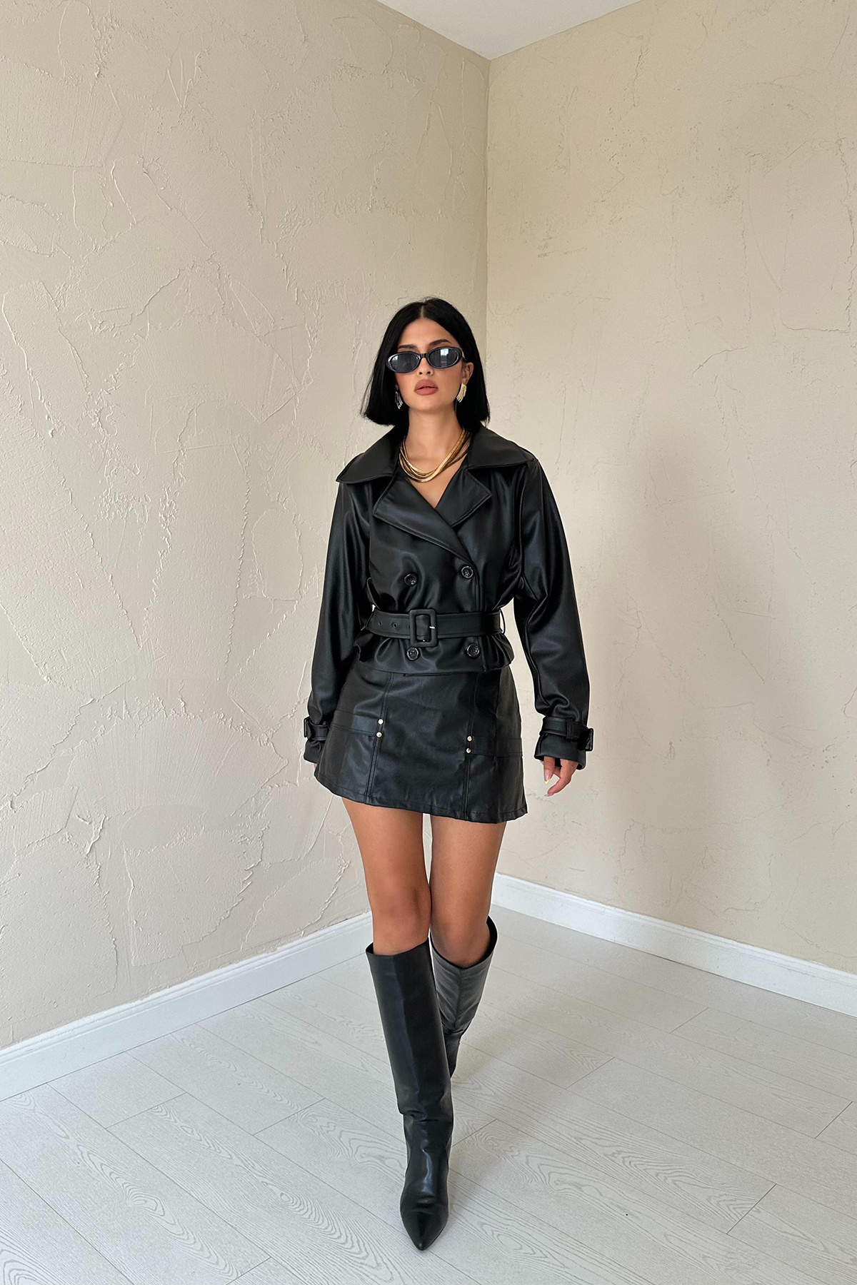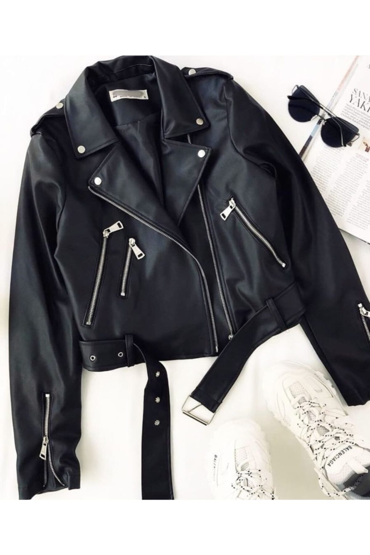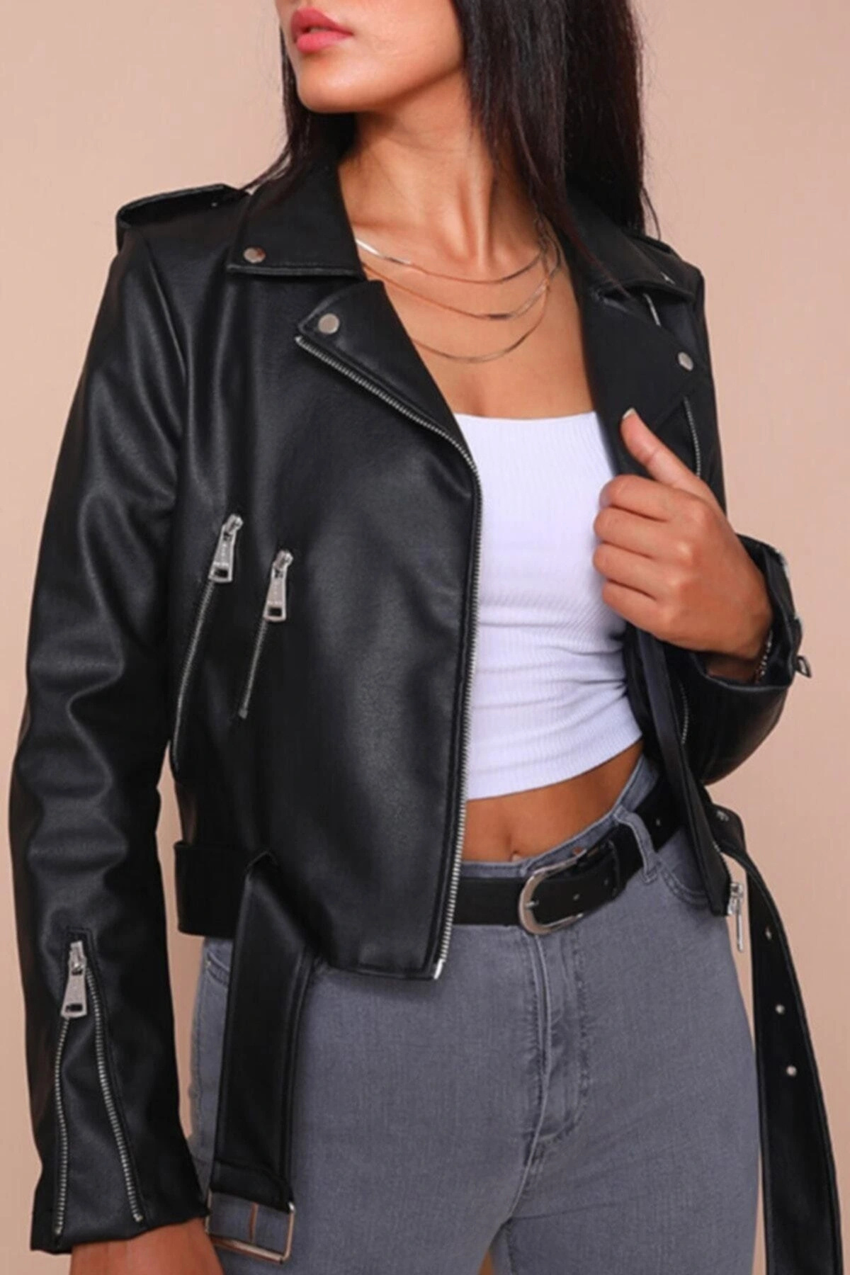 Kadın Siyah Kemerli Deri Ceket Kadın Siyah Kemerli Deri Ceket MZ400609BC 40