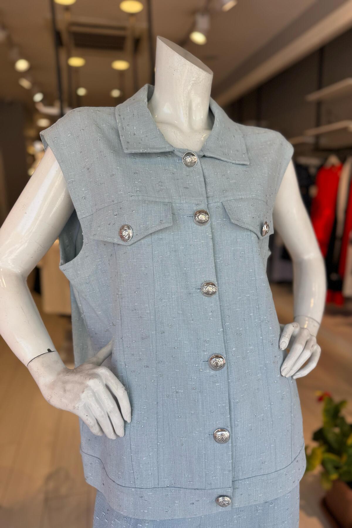 Yakallı Cepli Tahta Düğmeli Keten Yelek Yakallı Cepli Tahta Düğmeli Keten Yelek 231013 L/XL
