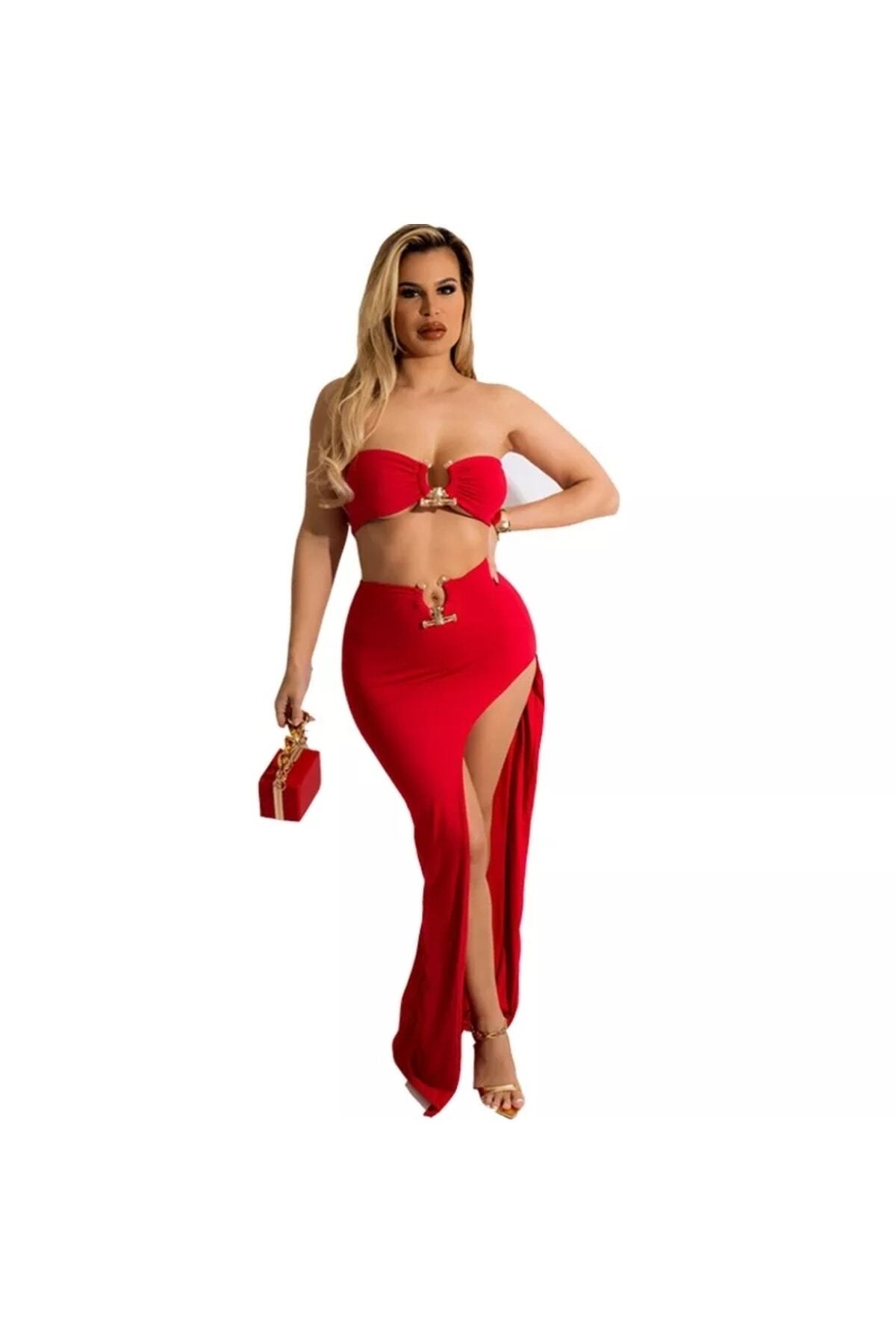 Dokuma Kumaş Alt Üst Yırtmaç Etek Crop Takım Dokuma Kumaş Alt Üst Yırtmaç Etek Crop Takım love1903 L