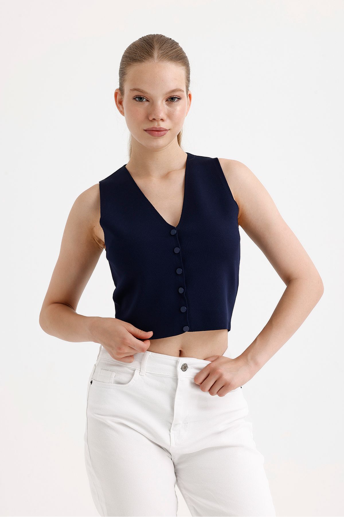 Kadın V Yaka ÇıtÇıtlı Pembe Triko Yelek Kadın V Yaka ÇıtÇıtlı Pembe Triko Yelek 2213 Standart