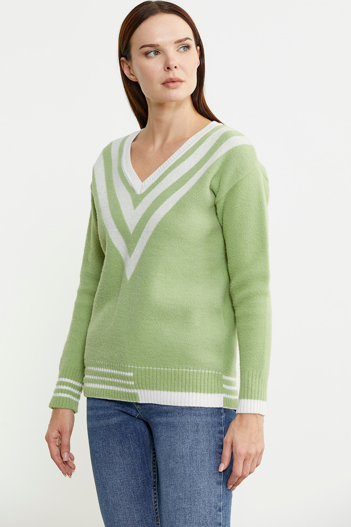 V Yaka Renk Kombinli Triko Kazak - Yeşil V Yaka Renk Kombinli Triko Kazak - Yeşil 24K2115-32515.0001 M