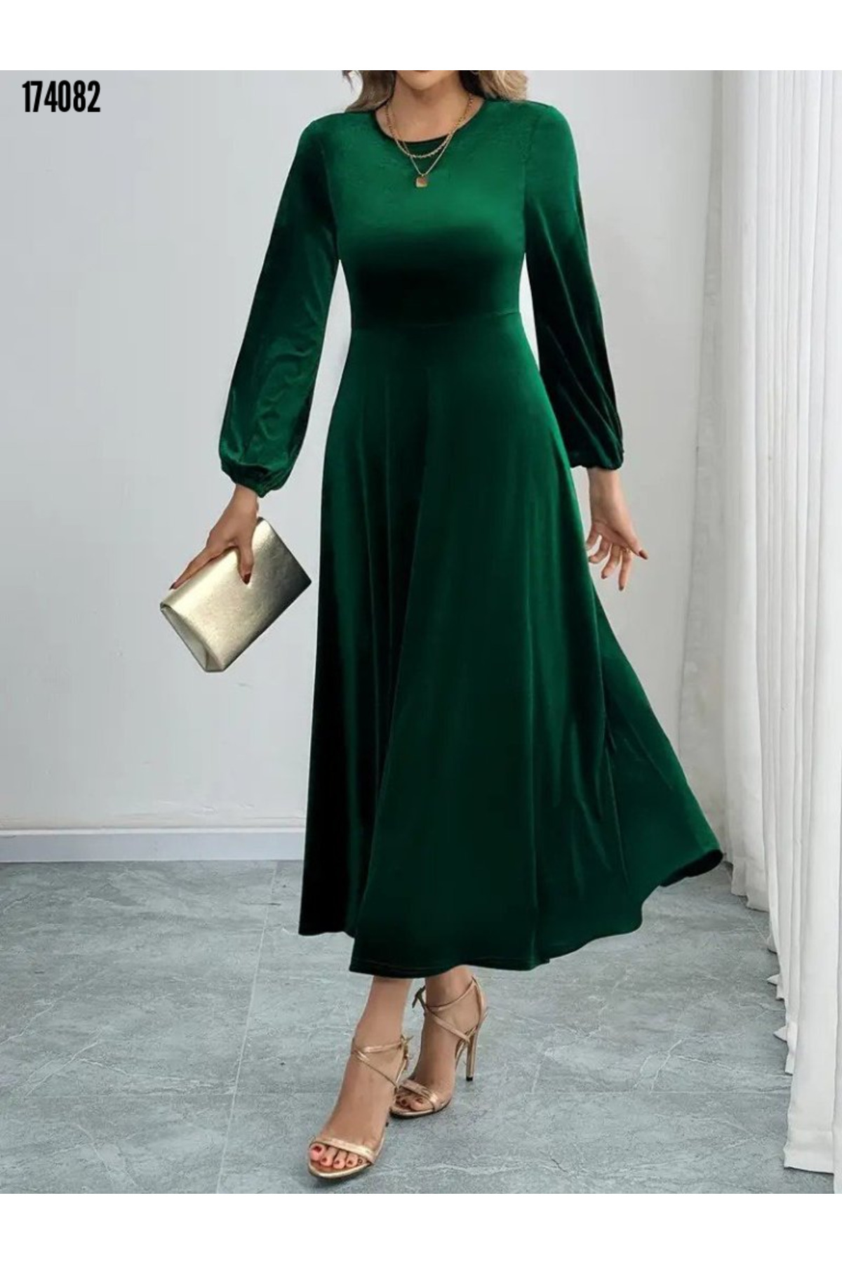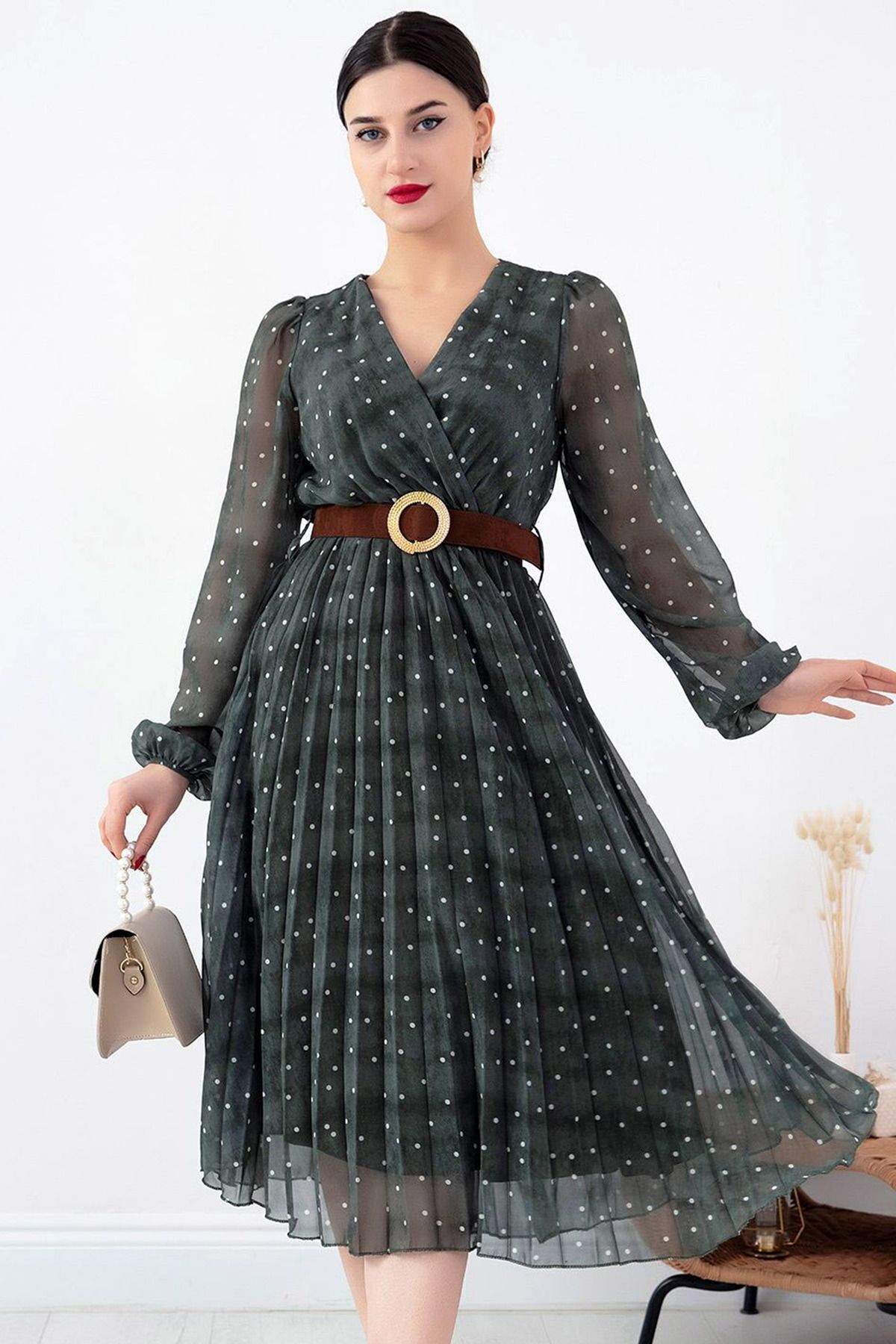 Kruvaze Yaka Puanlı Lastikli Uzun Balon Kollu Piliseli Astarlı Şık ve Cool Şifon Diz Altı Elbise Kruvaze Yaka Puanlı Lastikli Uzun Balon Kollu Piliseli Astarlı Şık ve Cool Şifon Diz Altı Elbise CBLG-0407 XL