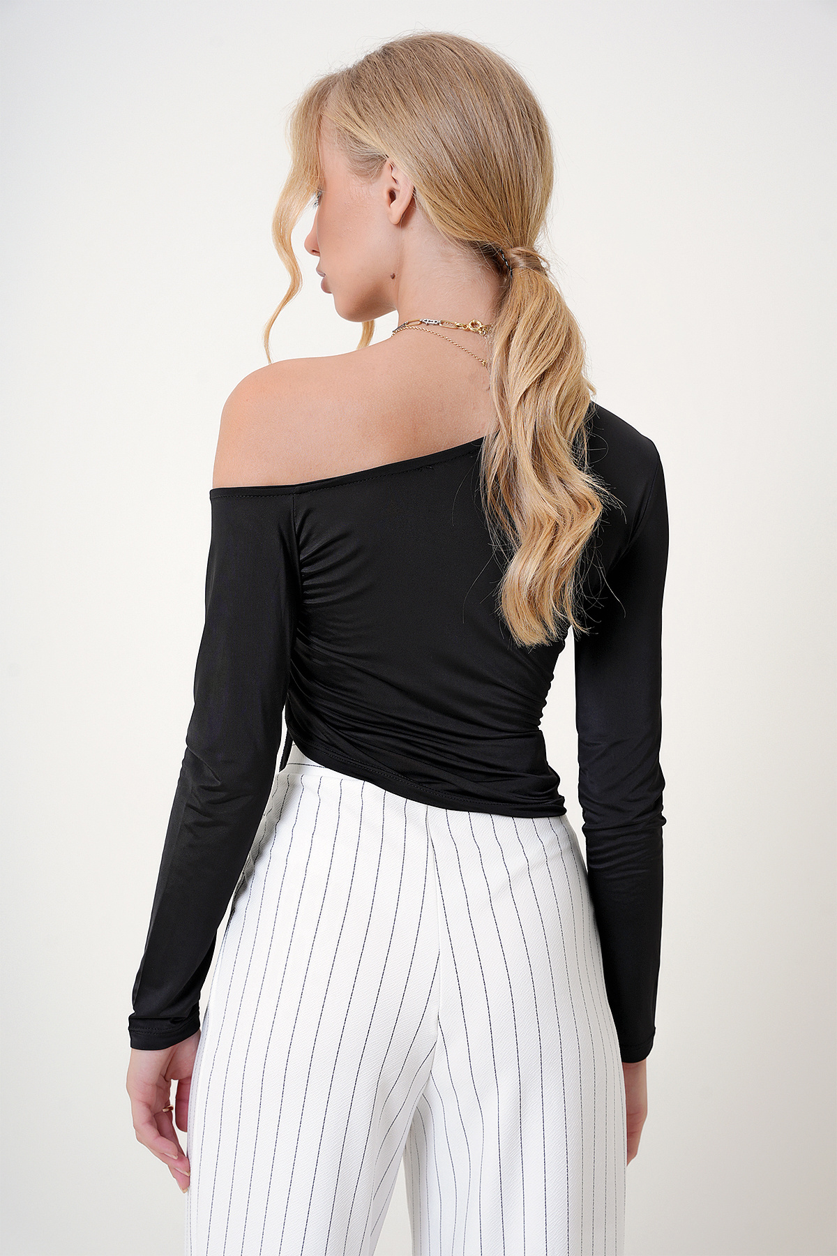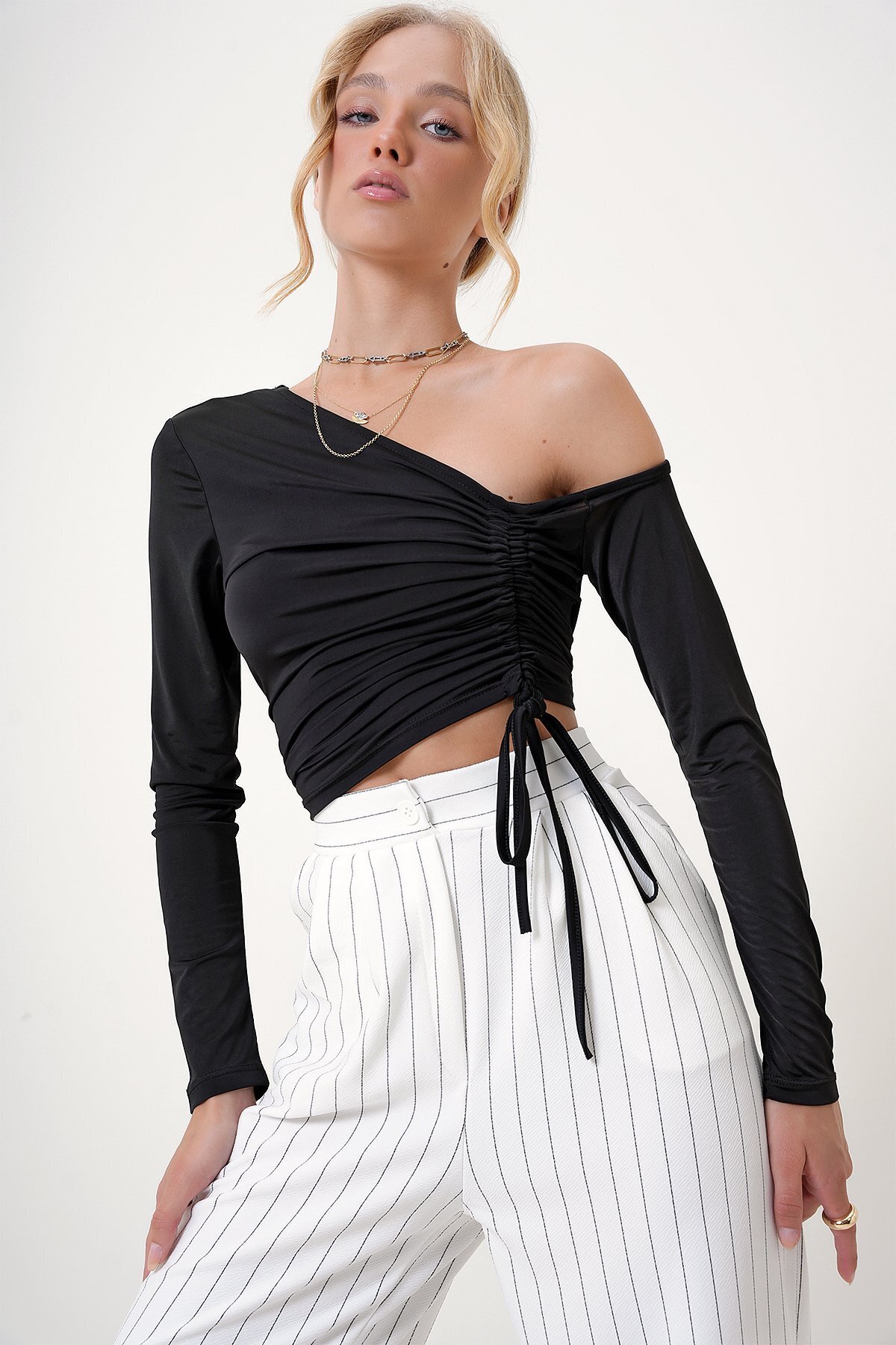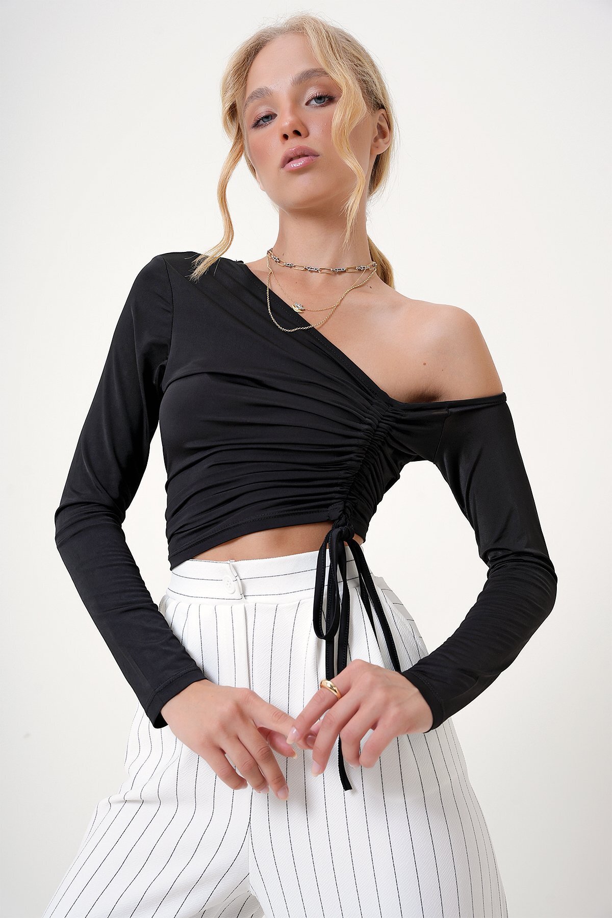 Kadın Siyah Asimetrik Yaka Büzgülü Sandy Crop Bluz ALC-X12746 Kadın Siyah Asimetrik Yaka Büzgülü Sandy Crop Bluz ALC-X12746 XL