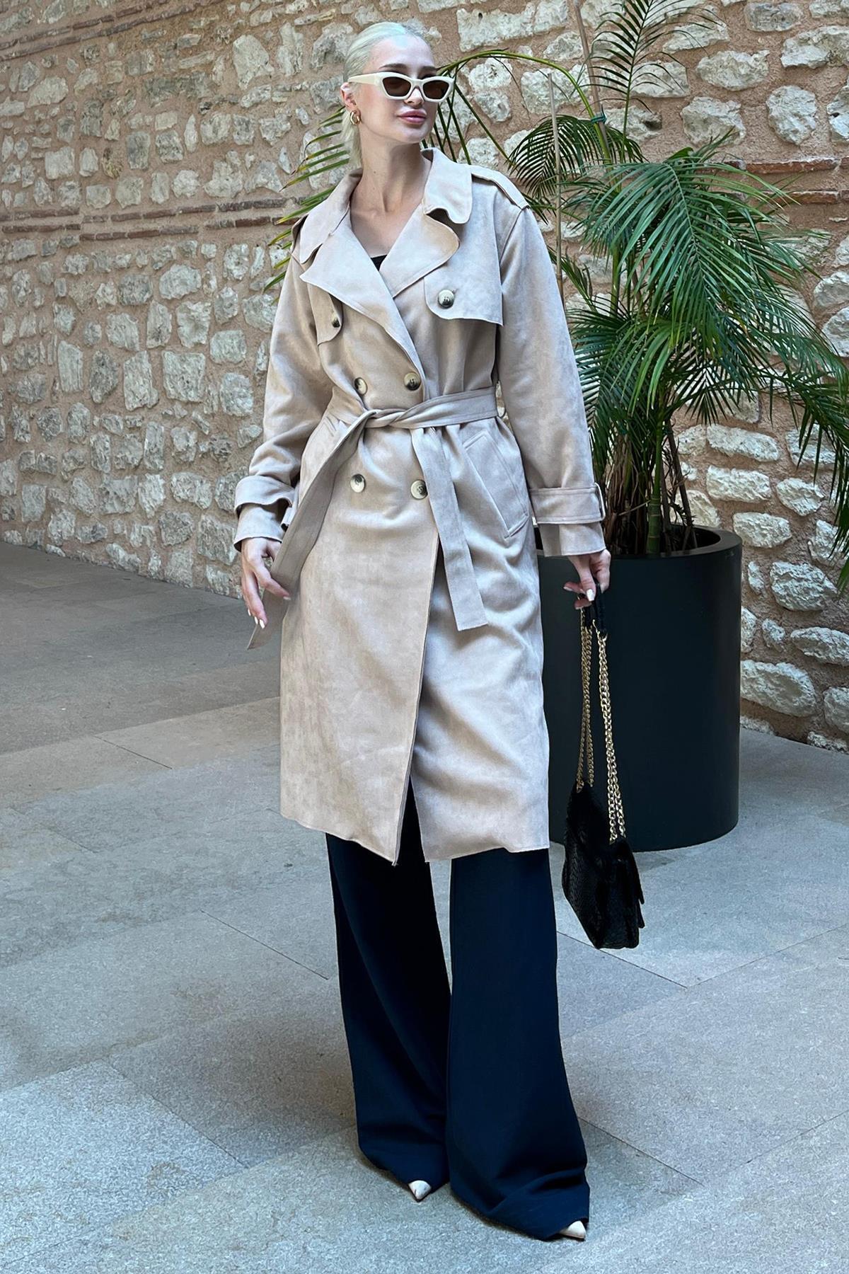 Bej Kadife Kumaşlı Düğmeli Kadın Trençkot SH187 Bej Kadife Kumaşlı Düğmeli Kadın Trençkot SH187 XL