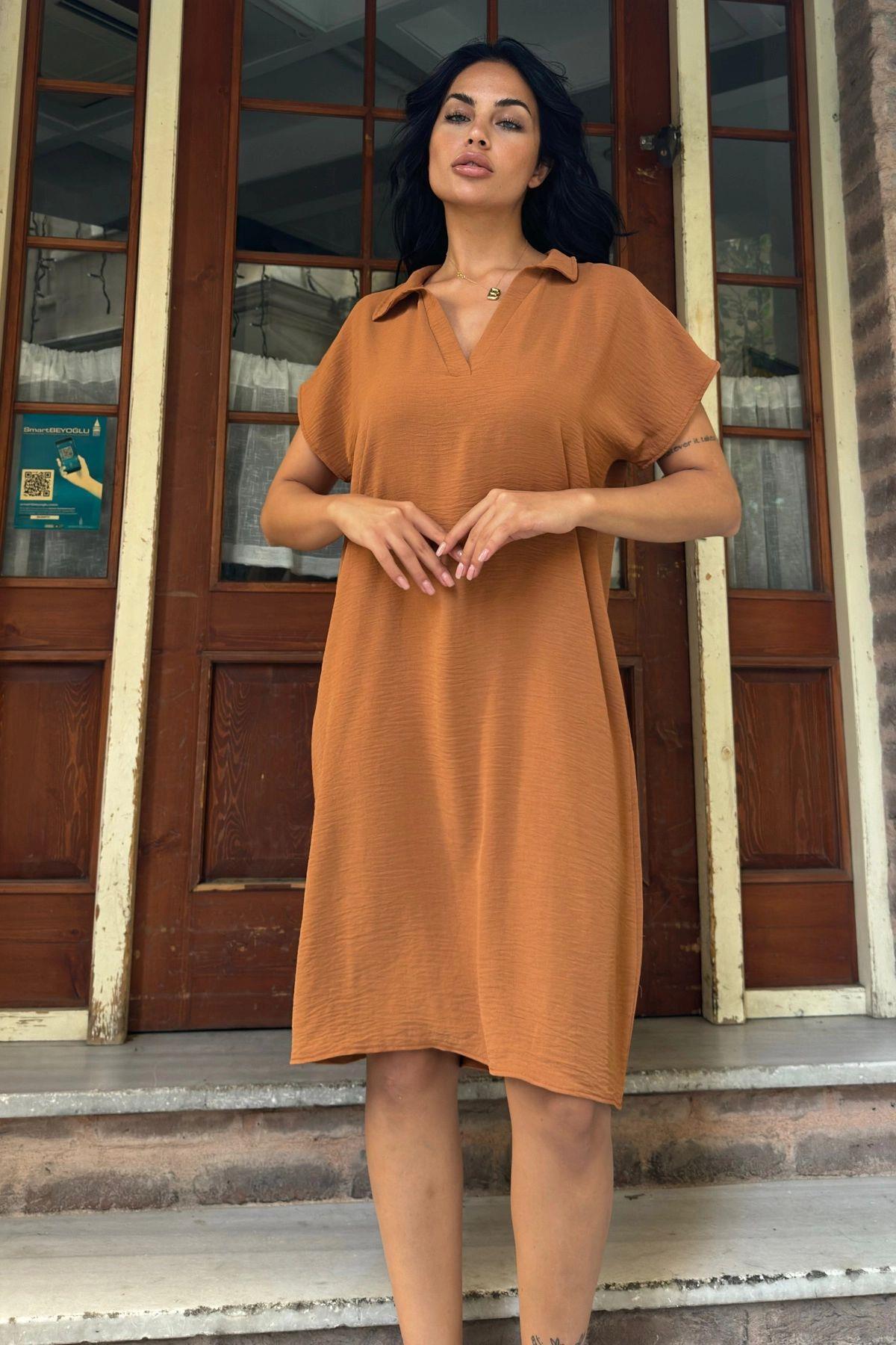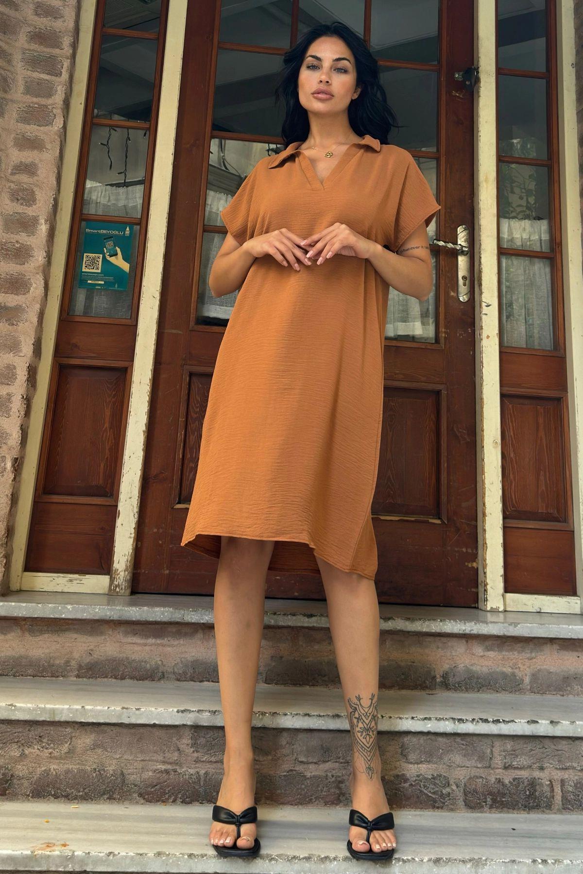 Taba Desenli Polo Yaka Rahat Midi Airobin Elbise Taba Desenli Polo Yaka Rahat Midi Airobin Elbise NY2883 42