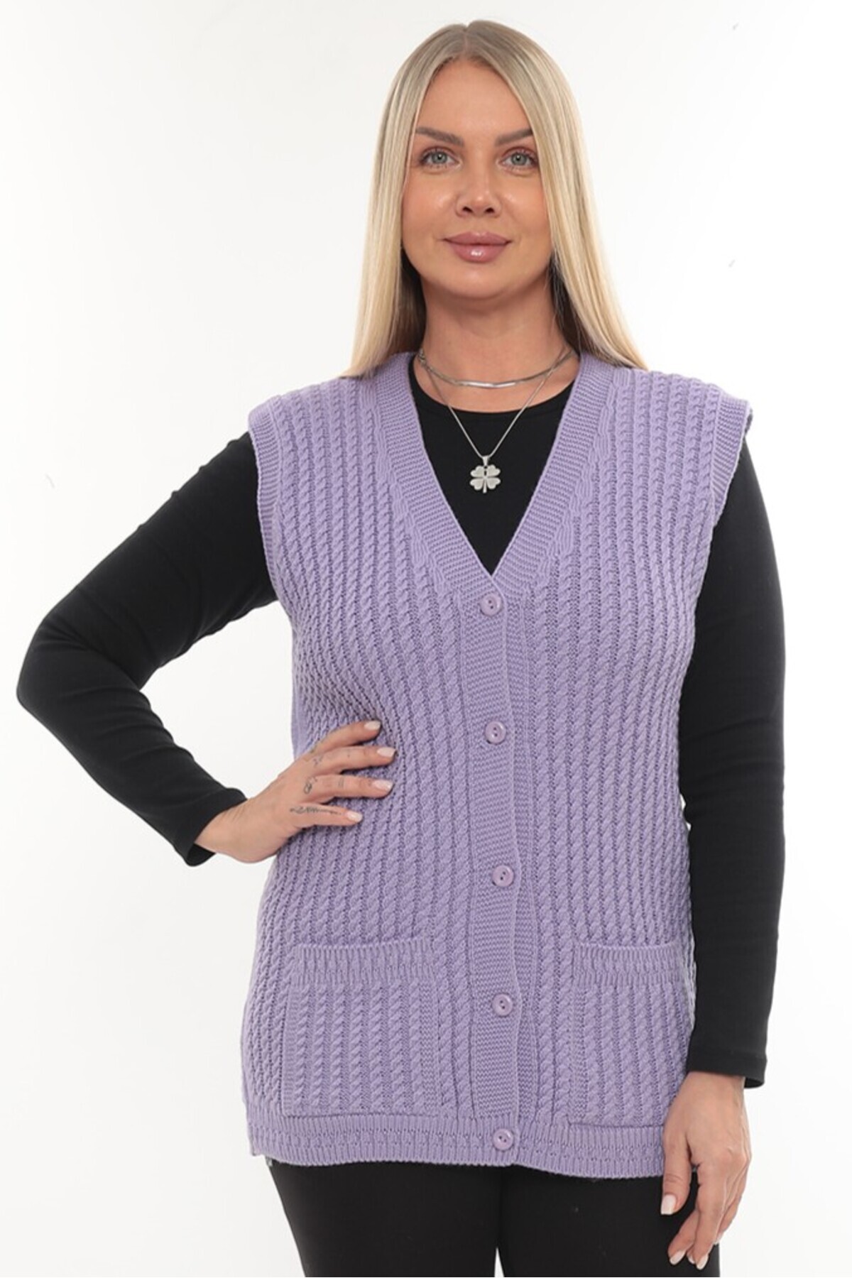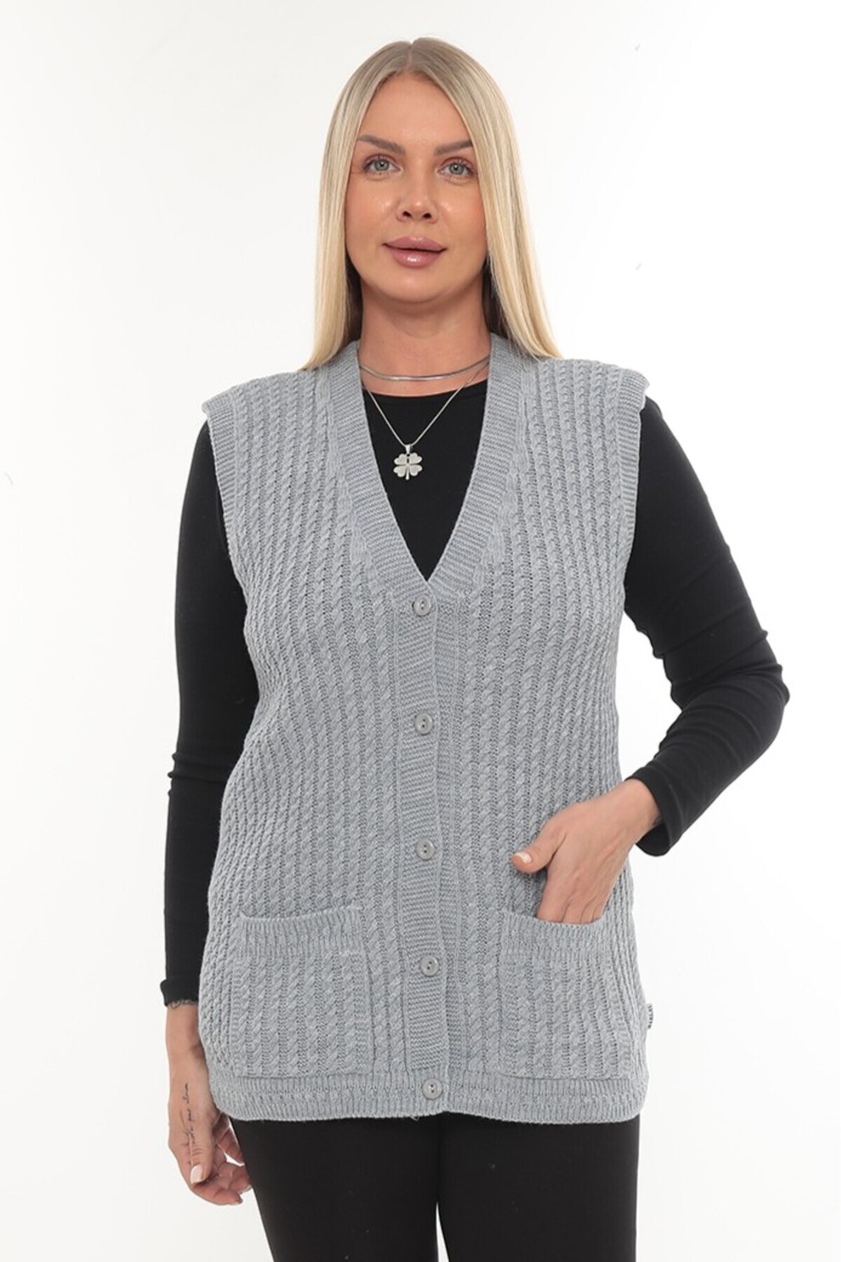 Kadın V Yaka Kışlık Kalın Yün Saç Örgü Modelli Triko Düğmeli Cepli Anne Yelek Kadın V Yaka Kışlık Kalın Yün Saç Örgü Modelli Triko Düğmeli Cepli Anne Yelek SAÇÇÖRGÜİKS Standart