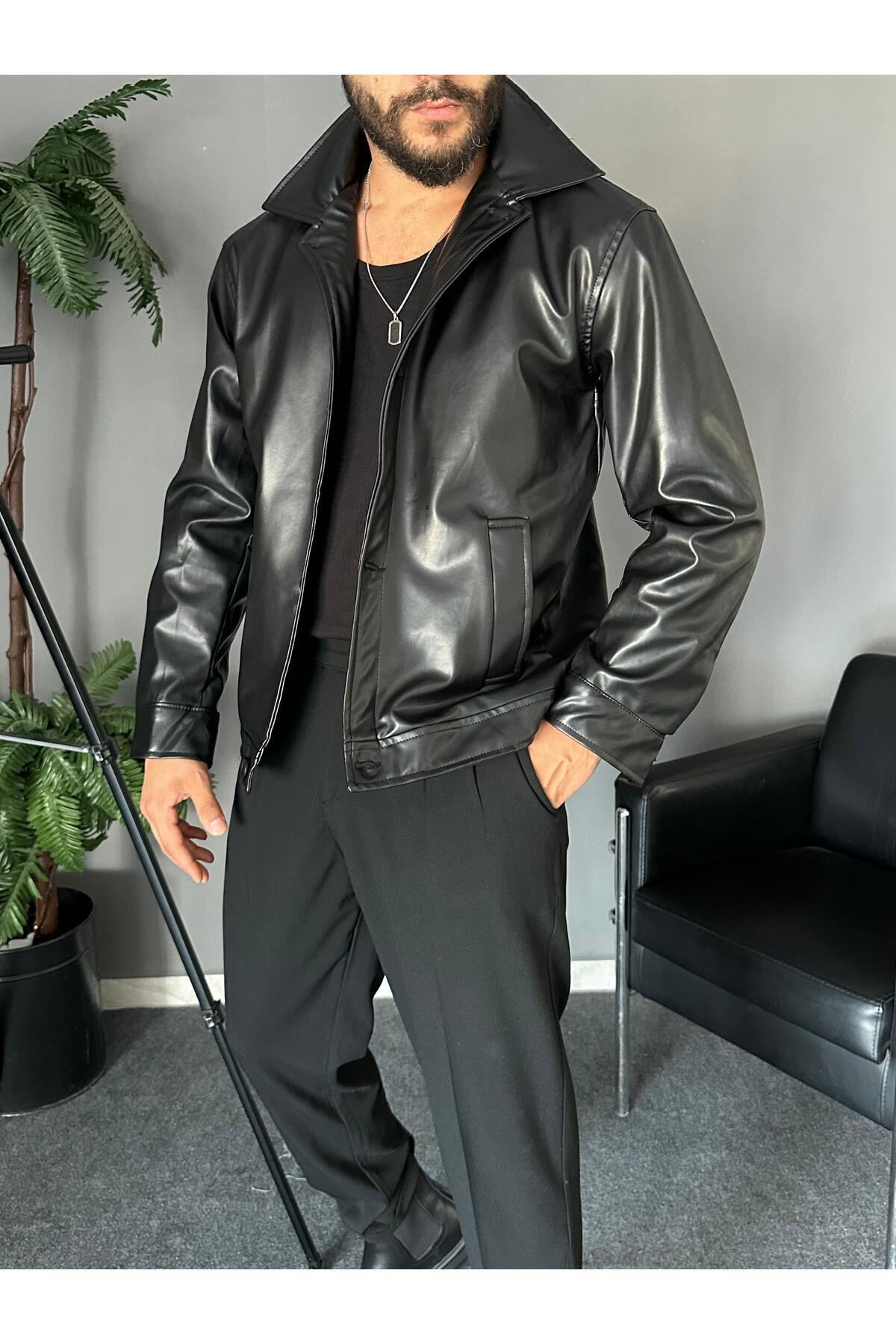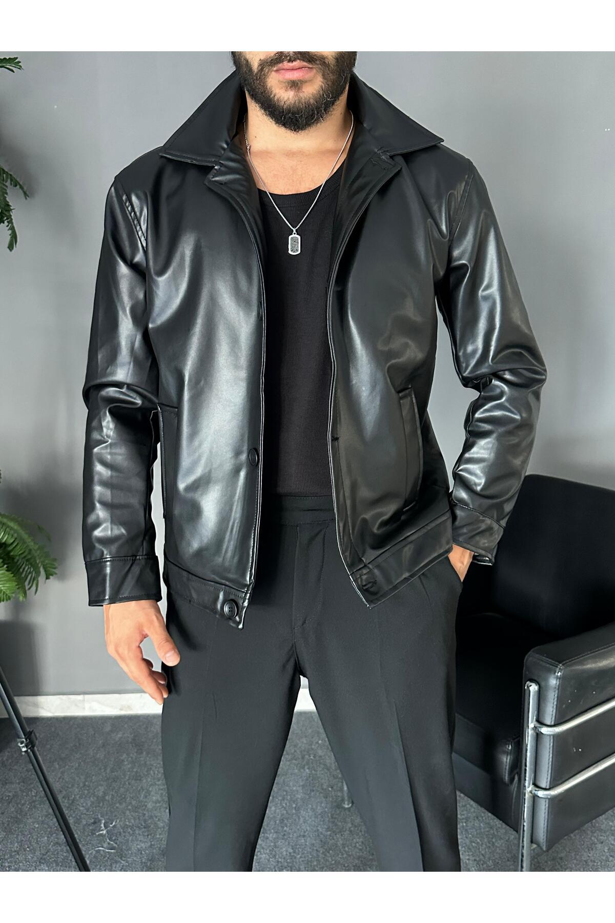Dik Yakalı Düğmeli Siyah Deri Mont Dik Yakalı Düğmeli Siyah Deri Mont 8190 XXL/P