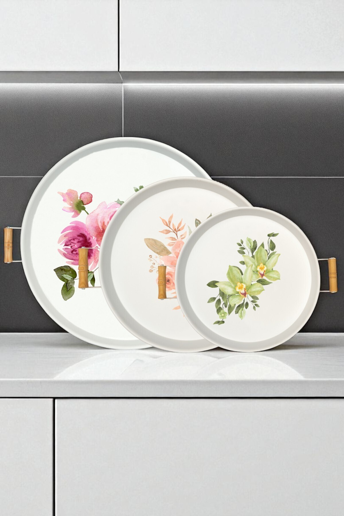 3 Adet Çiçek Desenli (45, 37, 30 CM) Ahşap Kulplu Metal Tepsi Çay Tepsisi Sunum Tepsi Seti 3 Adet Çiçek Desenli (45, 37, 30 CM) Ahşap Kulplu Metal Tepsi Çay Tepsisi Sunum Tepsi Seti M0198-BASKILI2 تک سایز