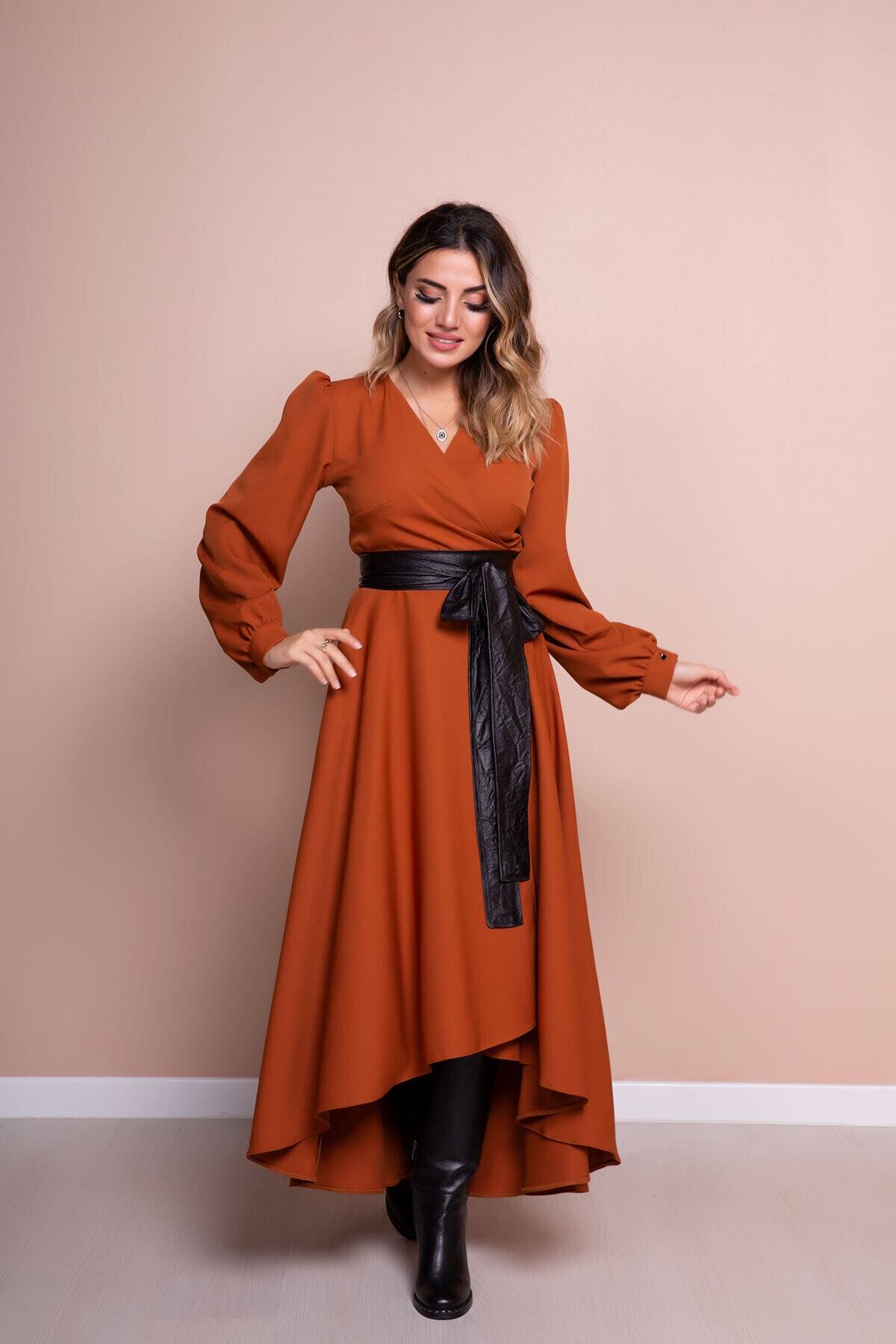 Kadın Kırmızı Siyah Deri Kemerli Uzun Kol Asimetrik Kesim Midi Boy Elbise Kadın Kırmızı Siyah Deri Kemerli Uzun Kol Asimetrik Kesim Midi Boy Elbise BM-0210-SYDK-MID 54