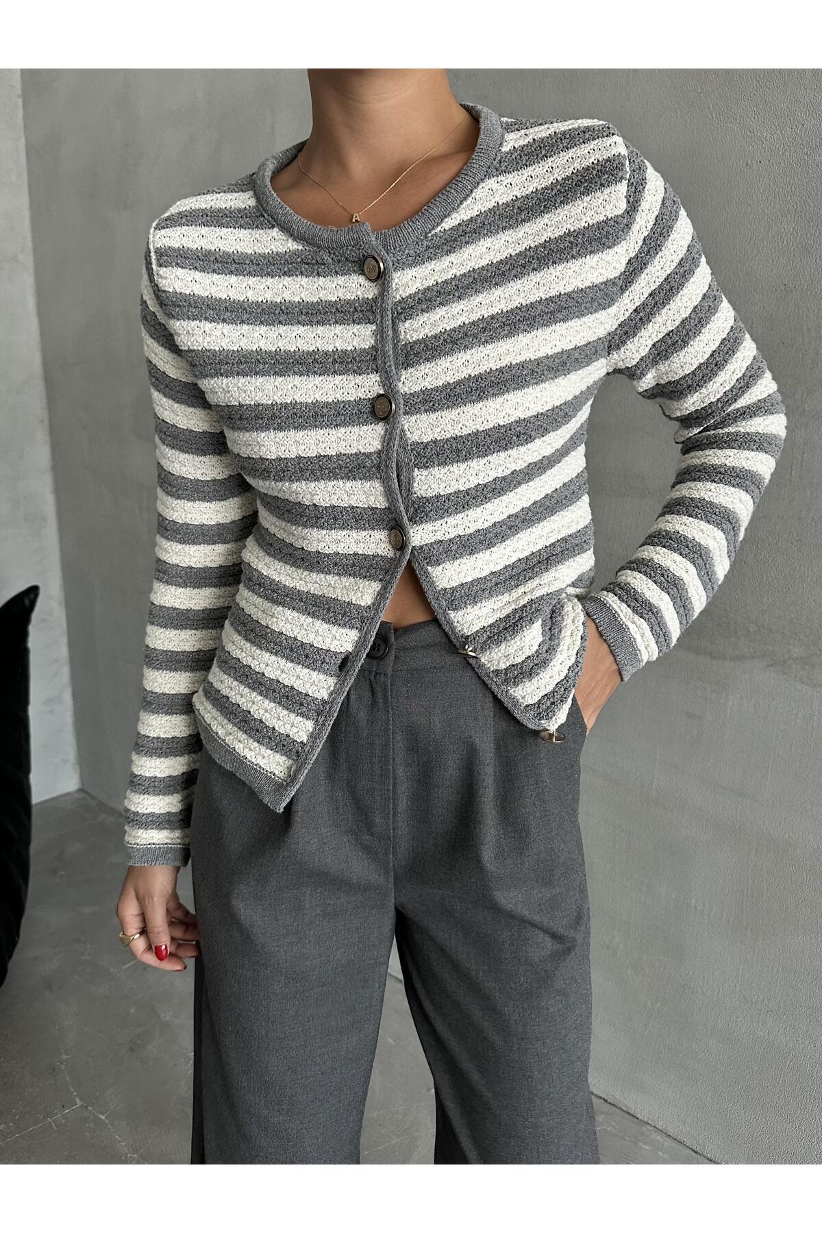Gri-Krem Mia Örme Yan Çizgili Hırka Gri-Krem Mia Örme Yan Çizgili Hırka Bİ-mia Standart