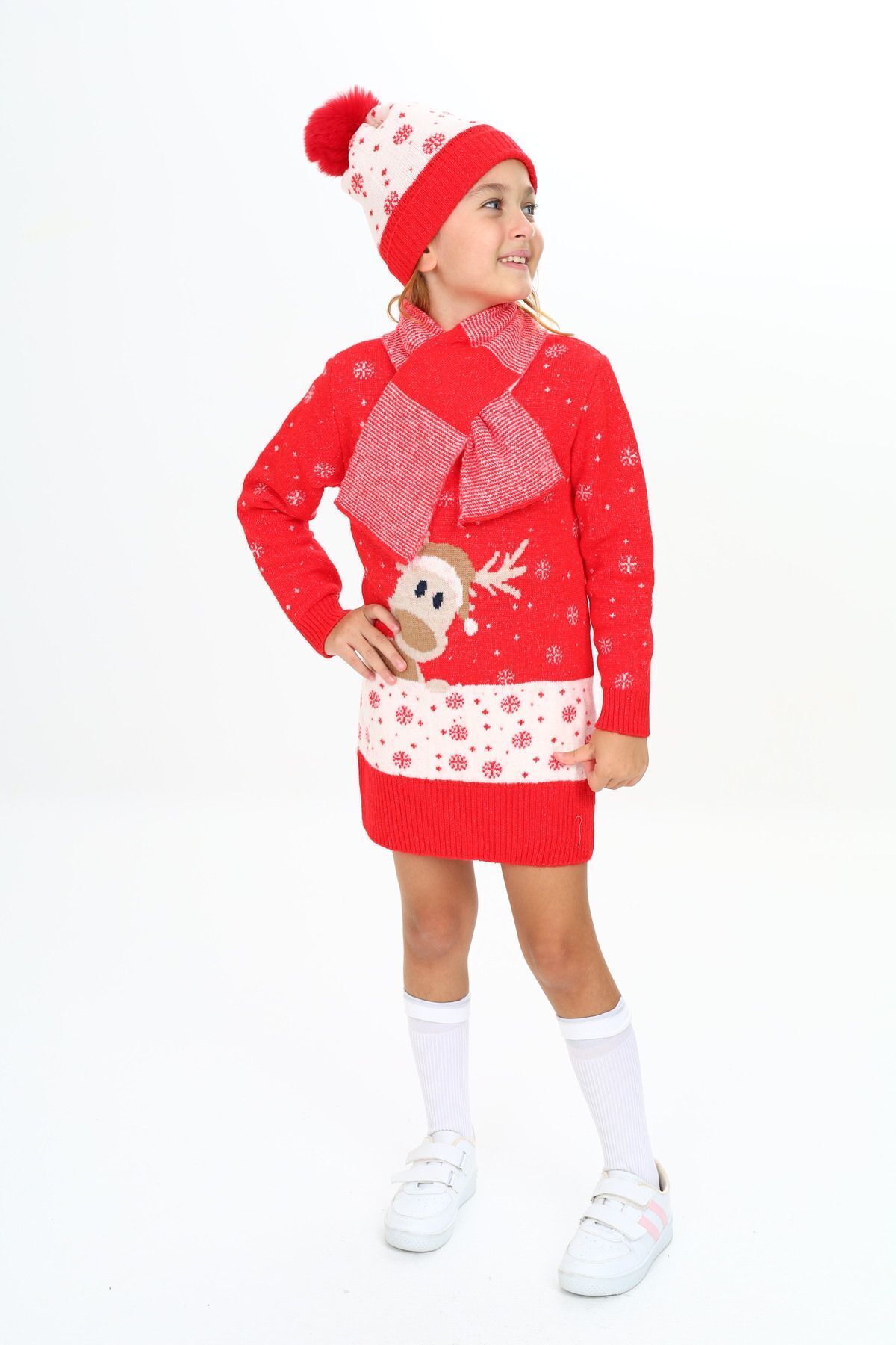 Kız Çocuk Elbise Karlar Içinde Geyik Desenli Bere Ve Atkılı 3'lü Takım Kız Çocuk Elbise Karlar Içinde Geyik Desenli Bere Ve Atkılı 3'lü Takım 6041 8-9 Yaş