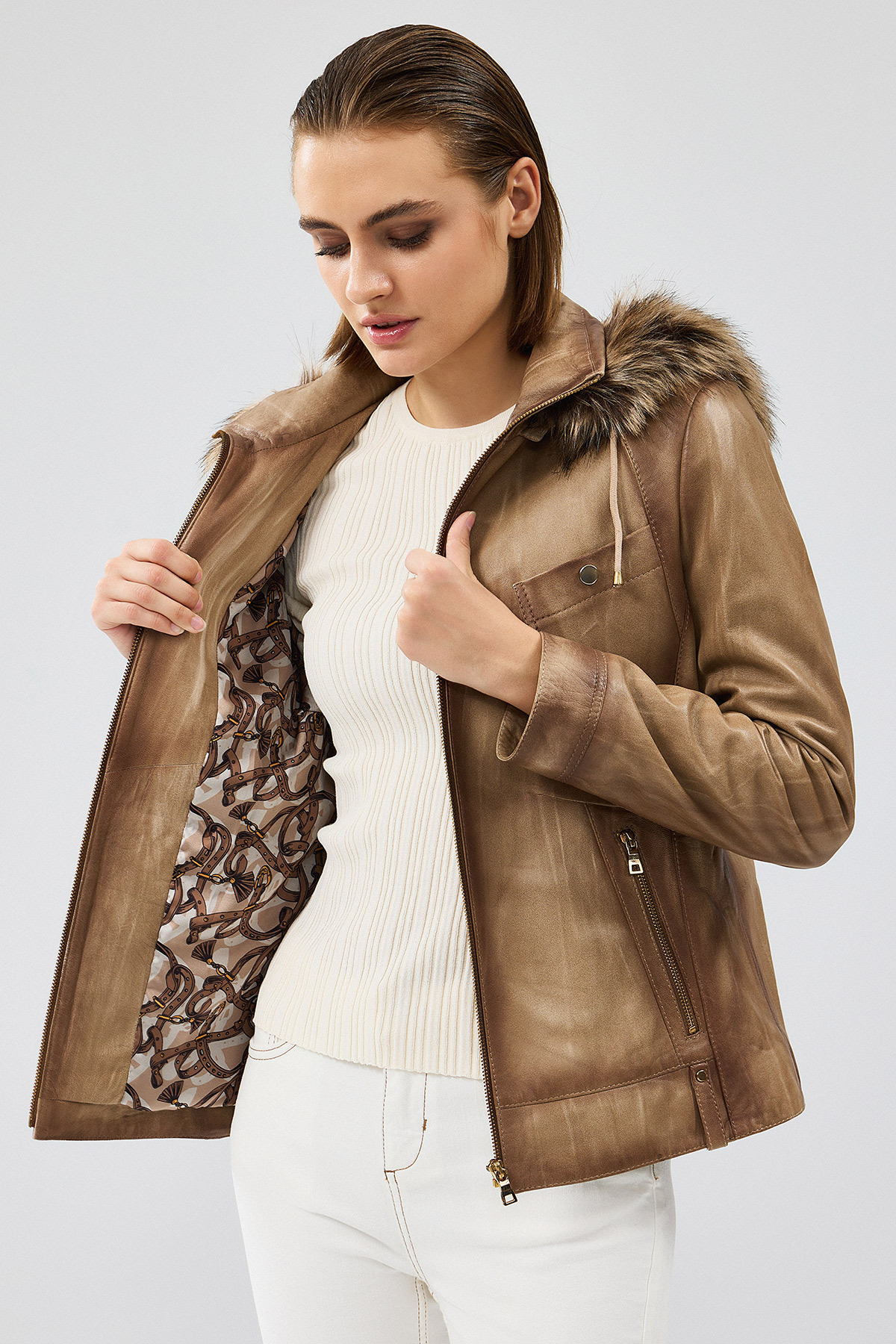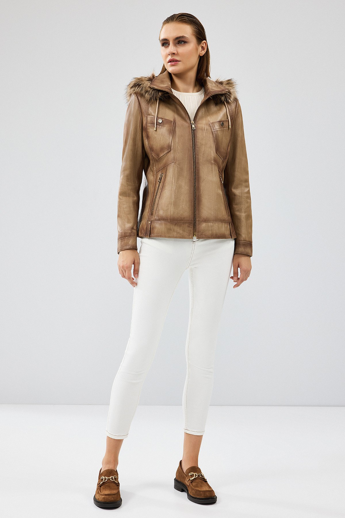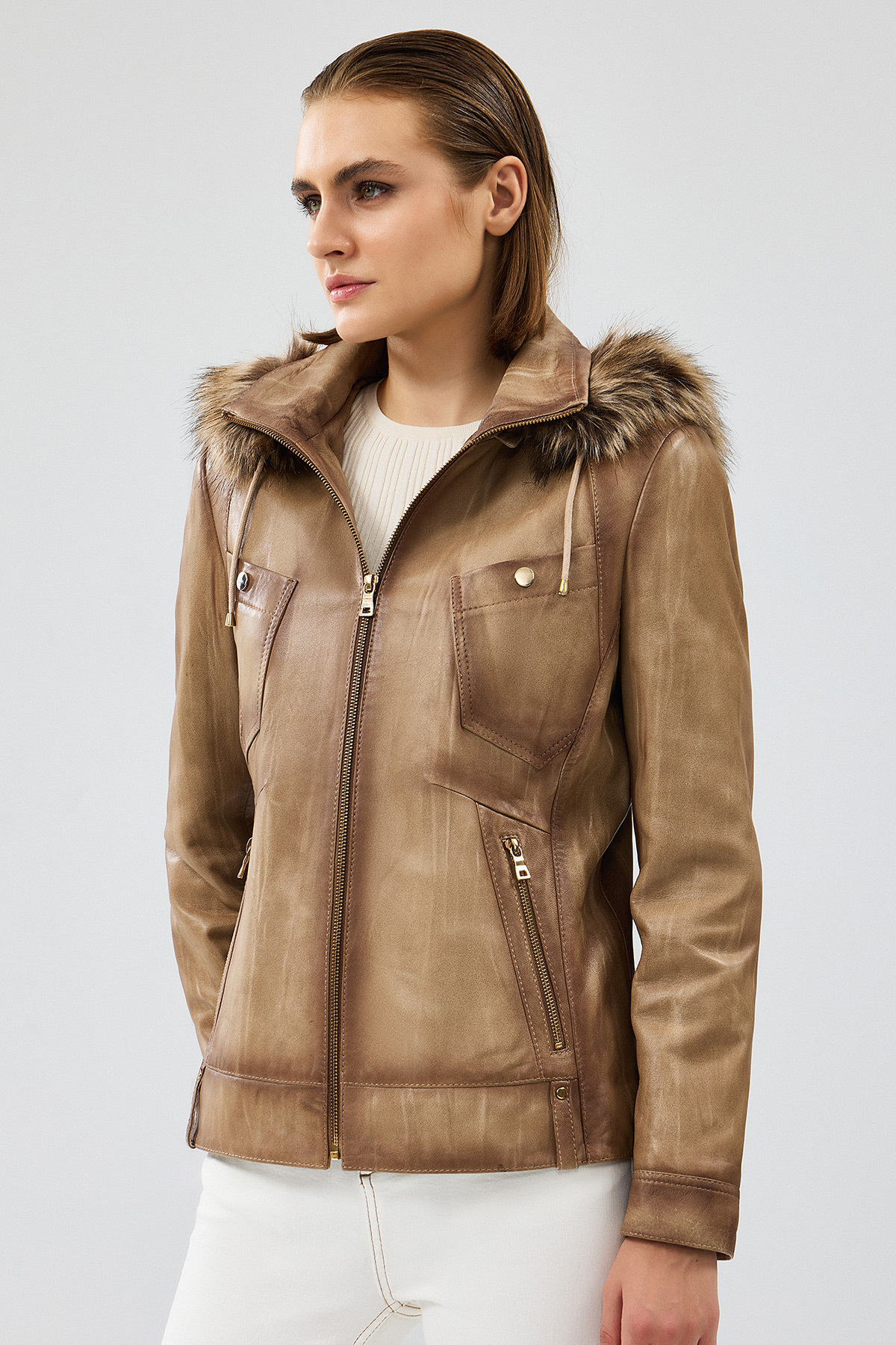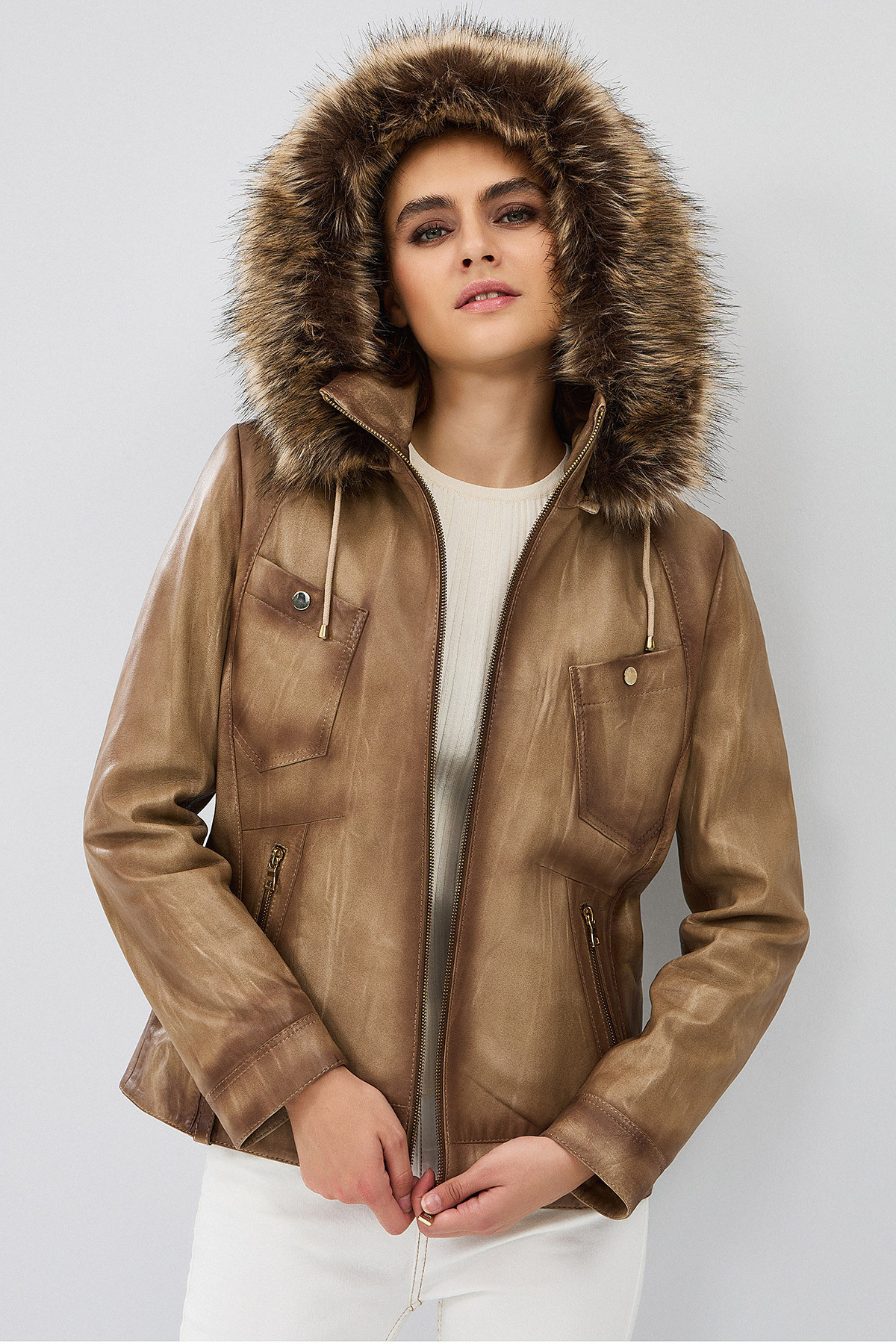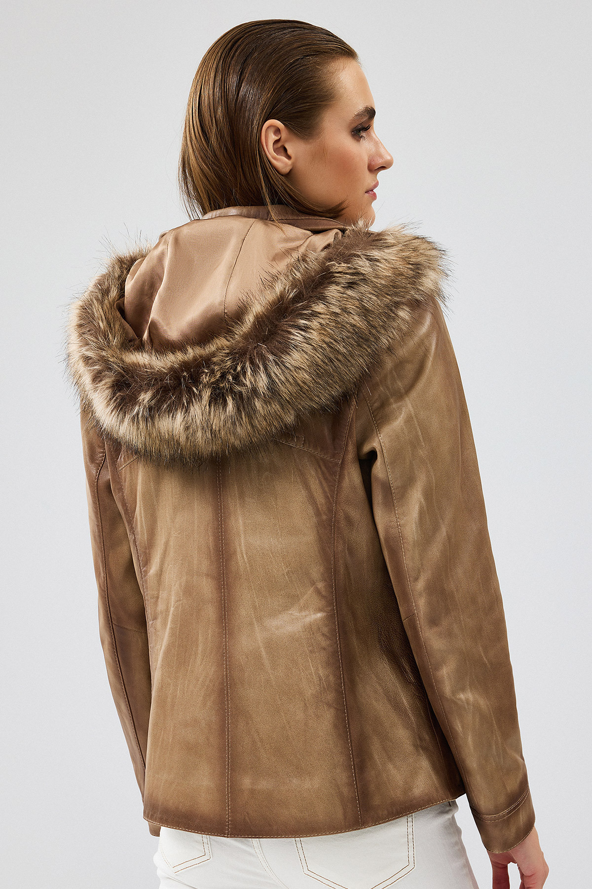 Meggy Kadın Bej Kapüşonlu Kürklü Deri Ceket 24WGE5210NC Meggy Kadın Bej Kapüşonlu Kürklü Deri Ceket 24WGE5210NC 3XL
