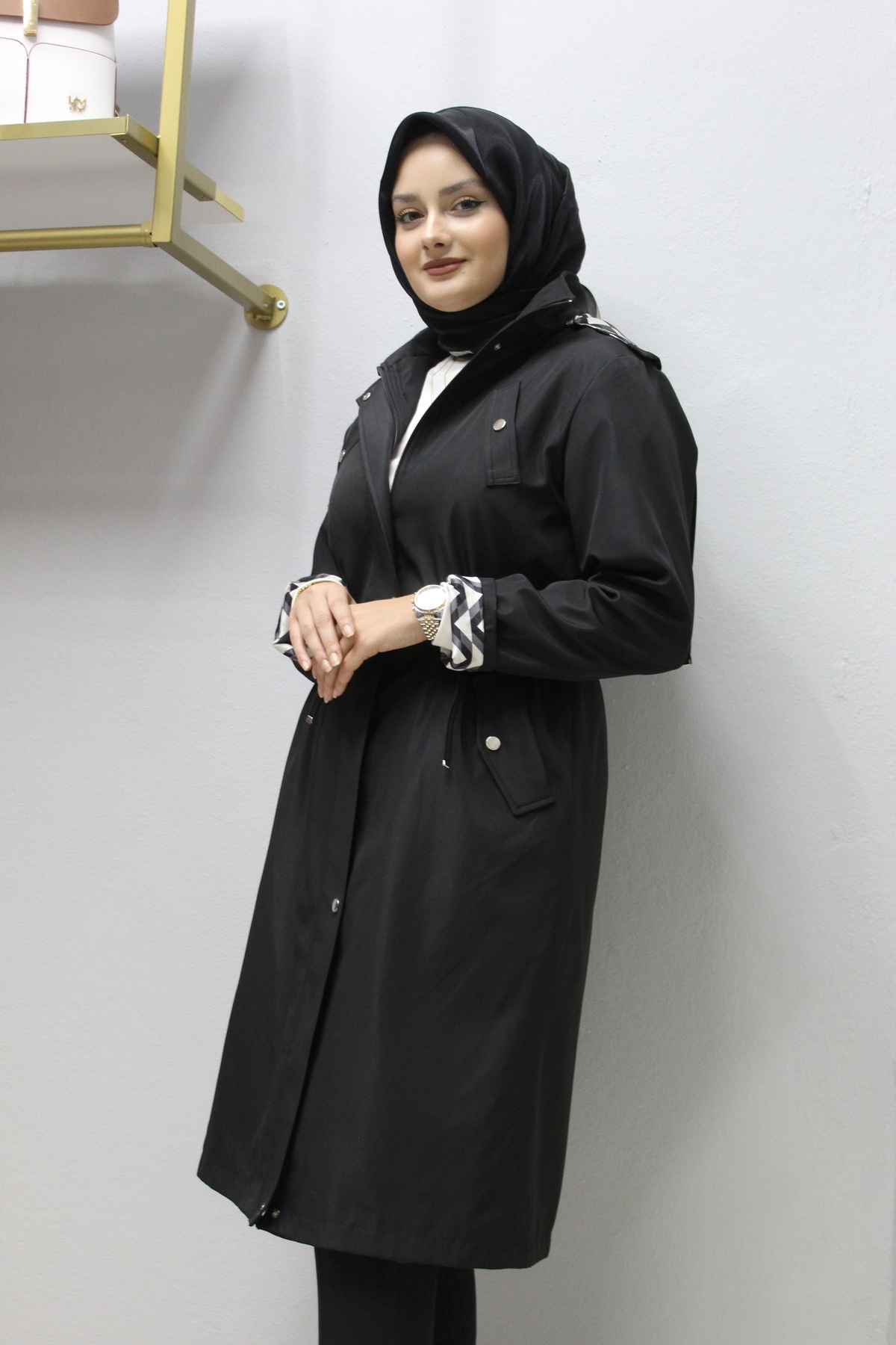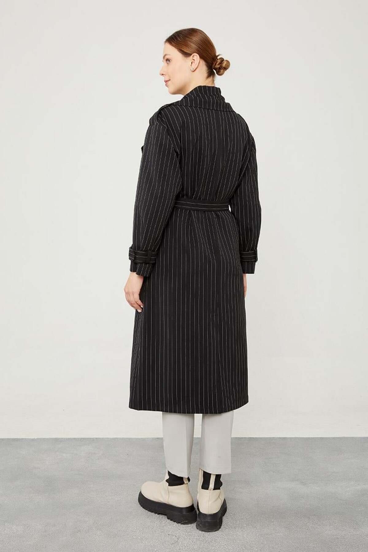 Siyah Çizgili Desen Kuşak Kapamalı Trençkot Siyah Çizgili Desen Kuşak Kapamalı Trençkot 530041 44
