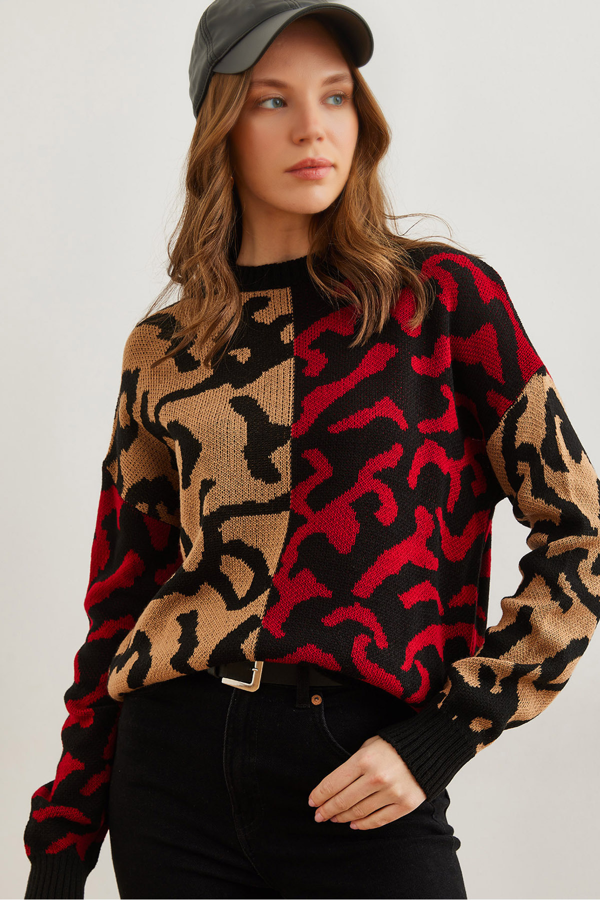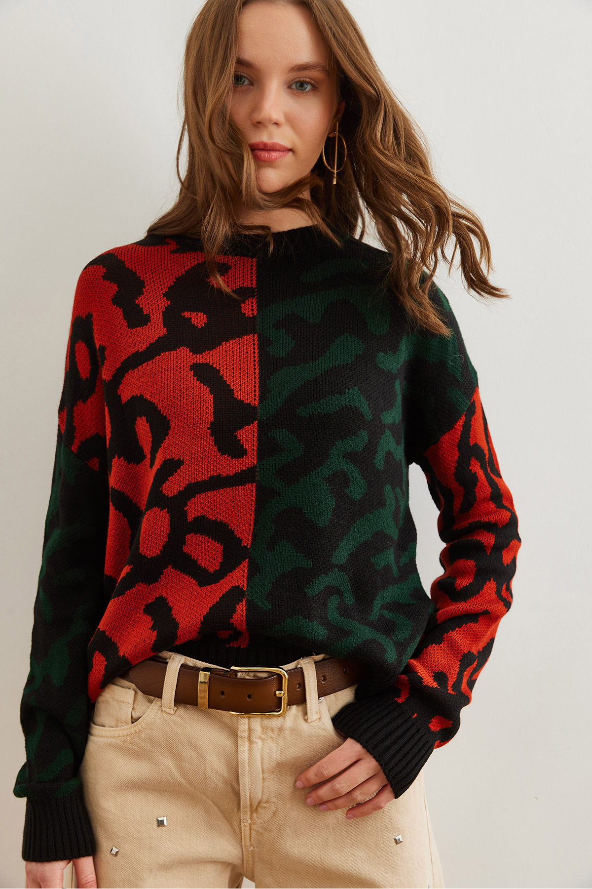 Kadın Turuncu Leopar Bloklu Triko Kazak KZK-19000832 Kadın Turuncu Leopar Bloklu Triko Kazak KZK-19000832 تک سایز